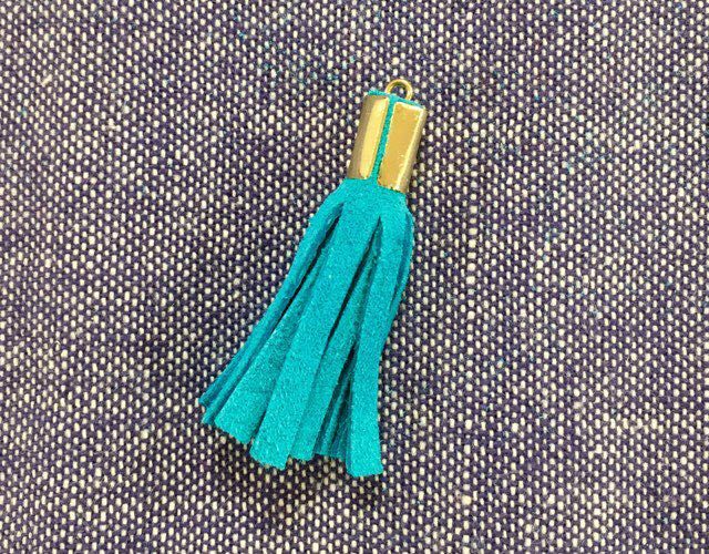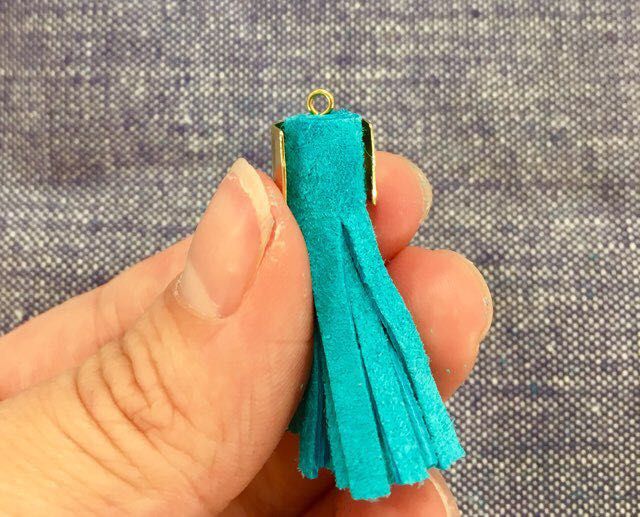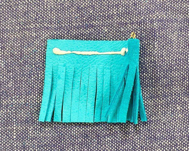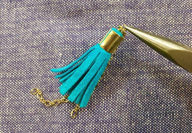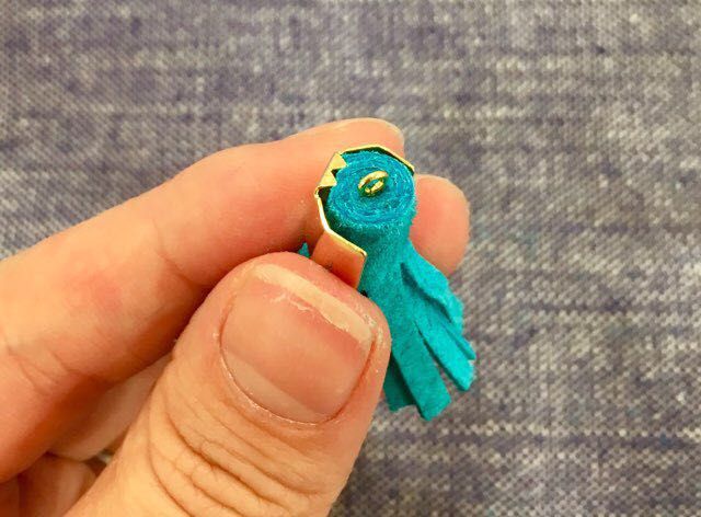 ③ツメ付留め金具にごく少量のボンドをつけ、フリンジの巻き終わりを下にして乗せる。