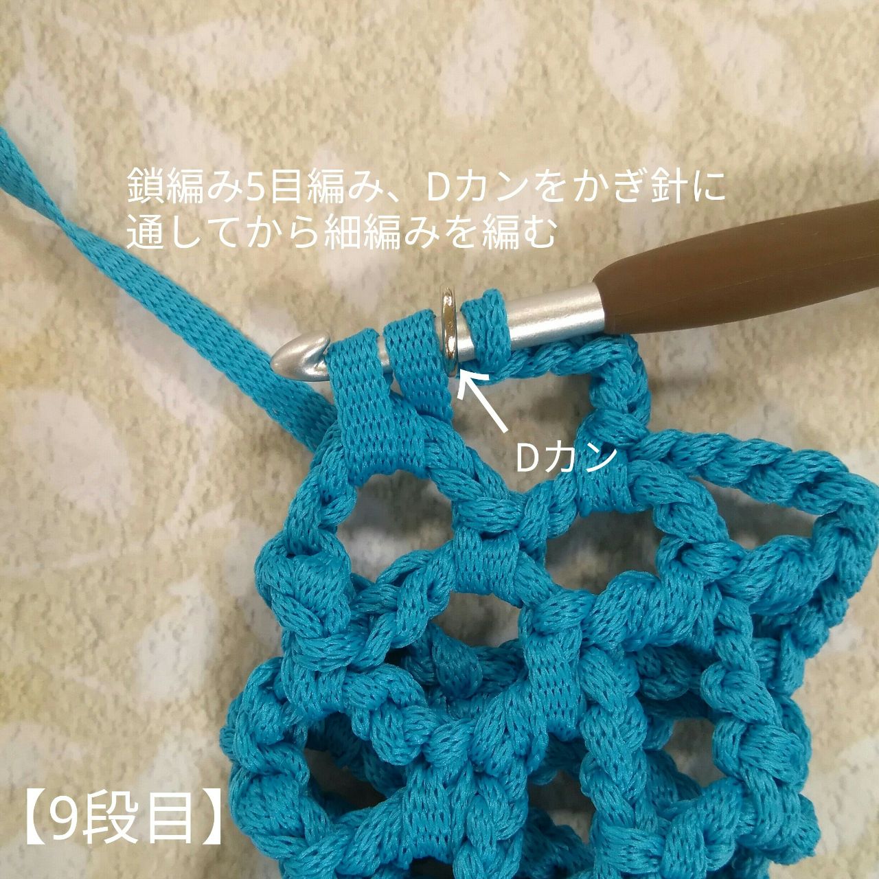 ネット編みを1つ編んだら、鎖編み5目の次にDカンを編み針に入れて、