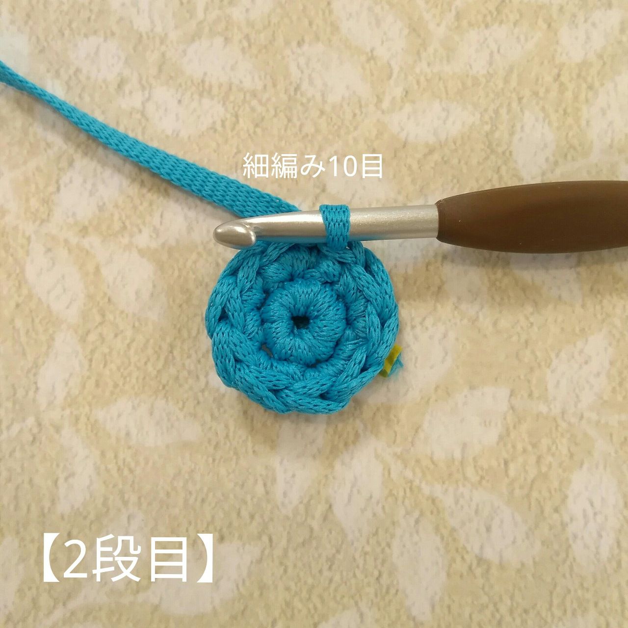 細編みを2段目の1目めの頭に編み入れます。