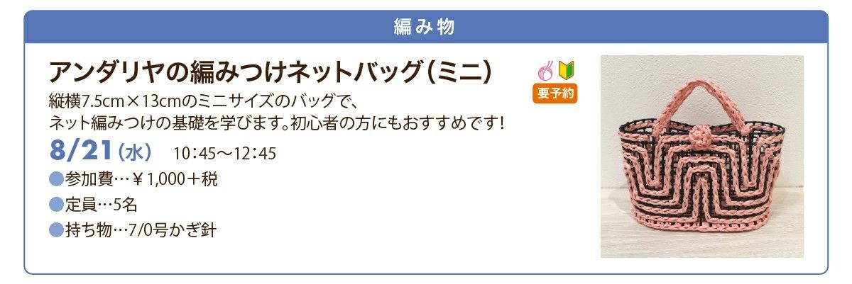アンダリヤの編みつけネットバッグ(ミニ)の講習会のご案内です!