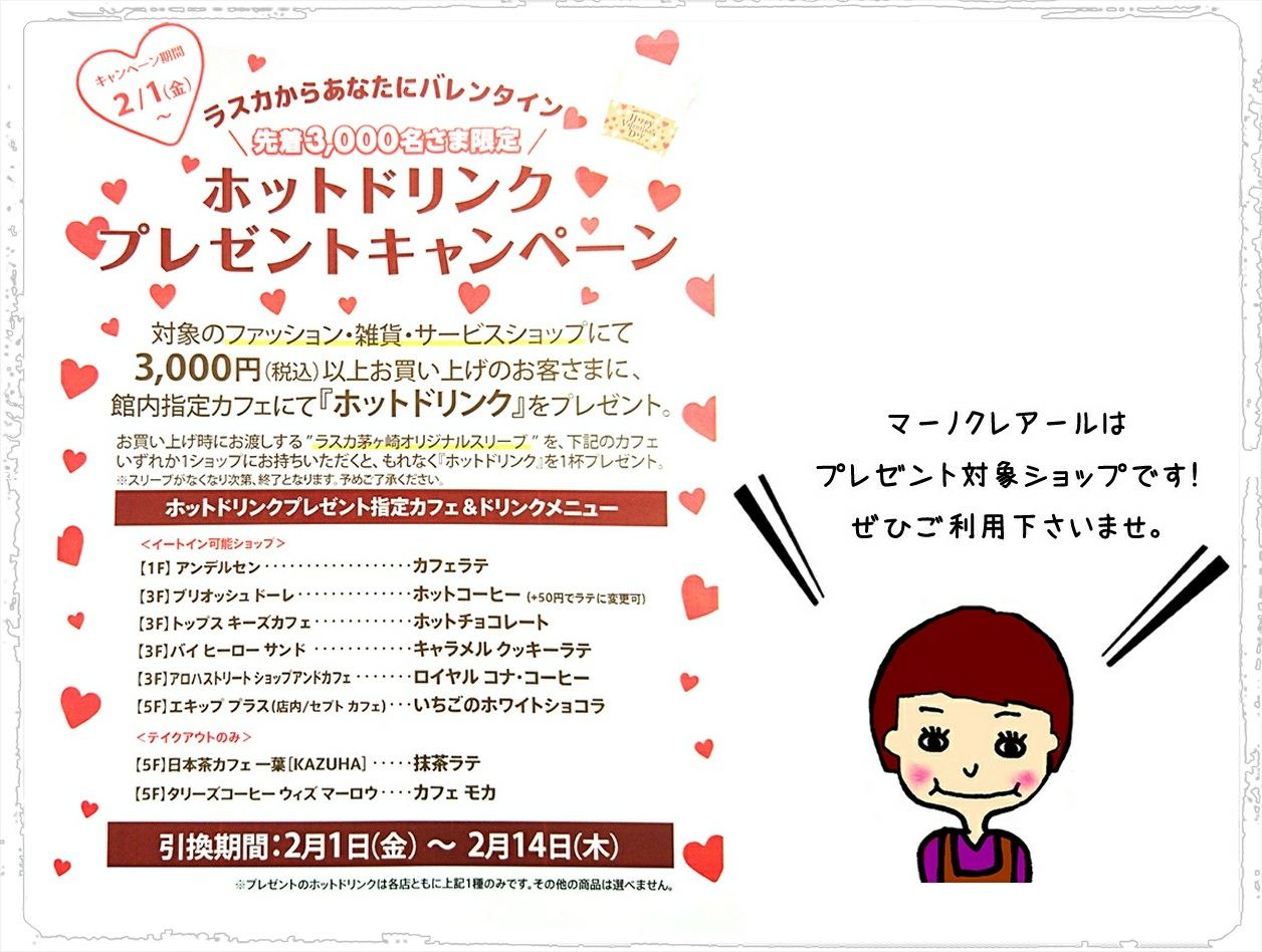 お買い上げ時にお渡しする“ラスカ茅ヶ崎オリジナルスリーブ”を対象(上記参照)の1ショップにお持ちいただくと、もれなく「ホットドリンク」を1杯プレゼント。