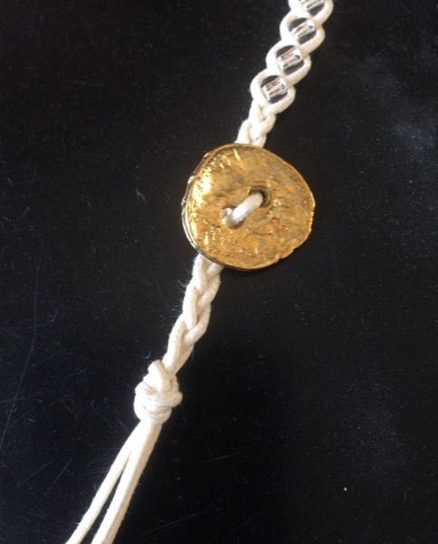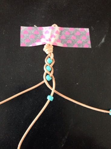 ビーズを全部編み終えたら留めボタンパーツをコードに通し三つ編みをしていきます。