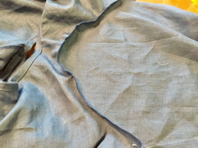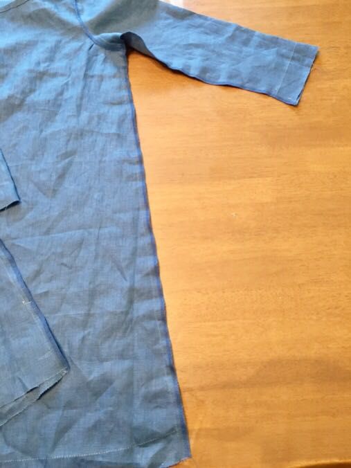 袖と裾を三つ折りにして表からステッチをかけて出来上がり〜