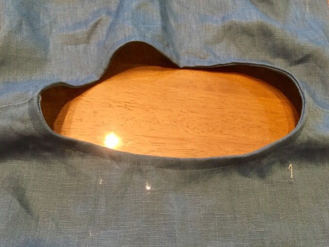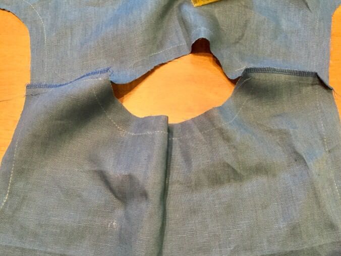 ④衿ぐりにバイヤスをつけ、しつけをかけて