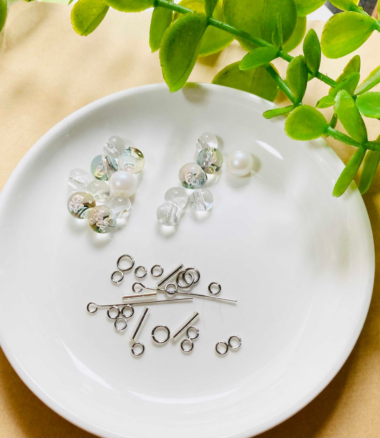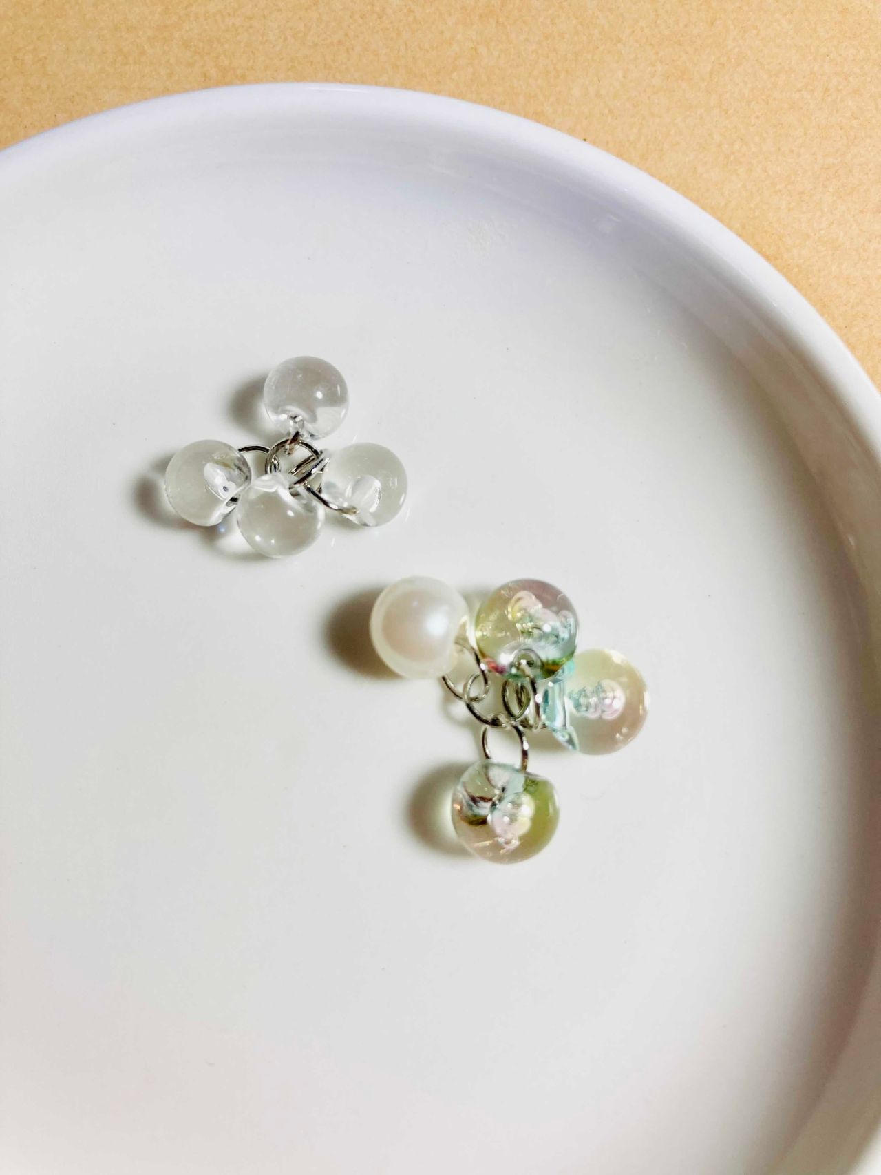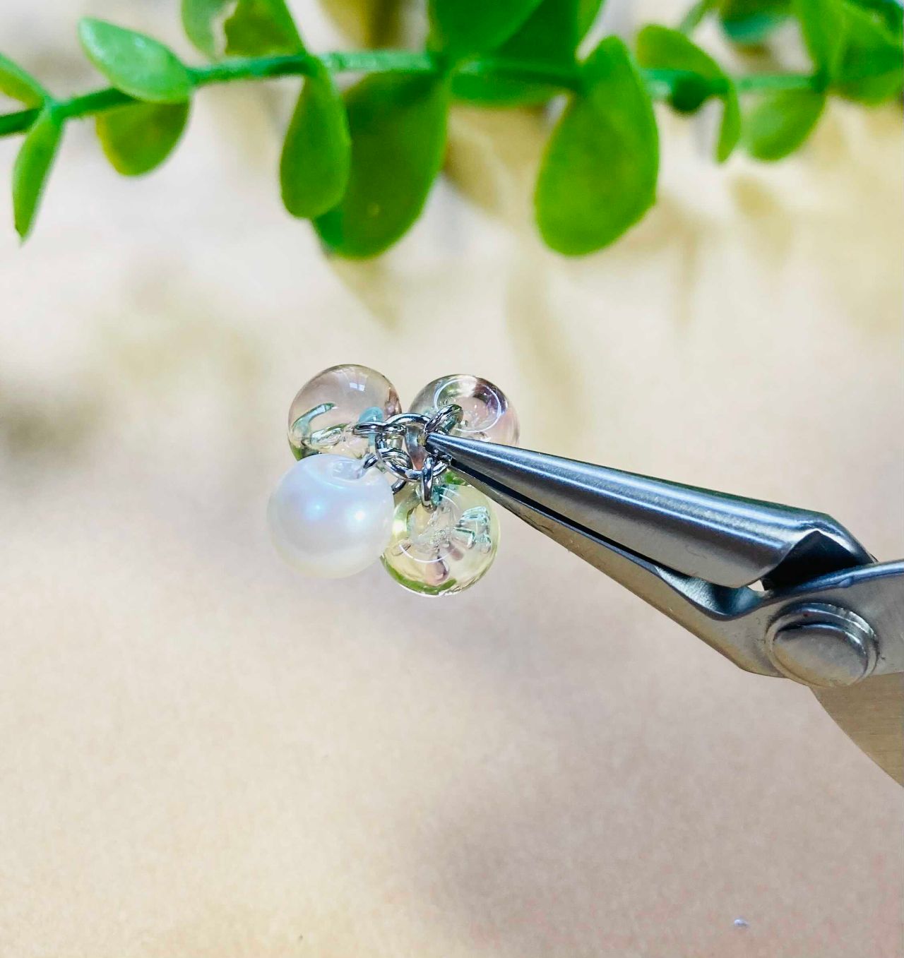 1.今日作るビーズイヤリングは上部に8ミリのバブルシャボン3玉とパール1玉の計4玉、下部に6ミリクリスタルを4玉と、片耳あたり上下で8玉に丸カンを付けていきます。