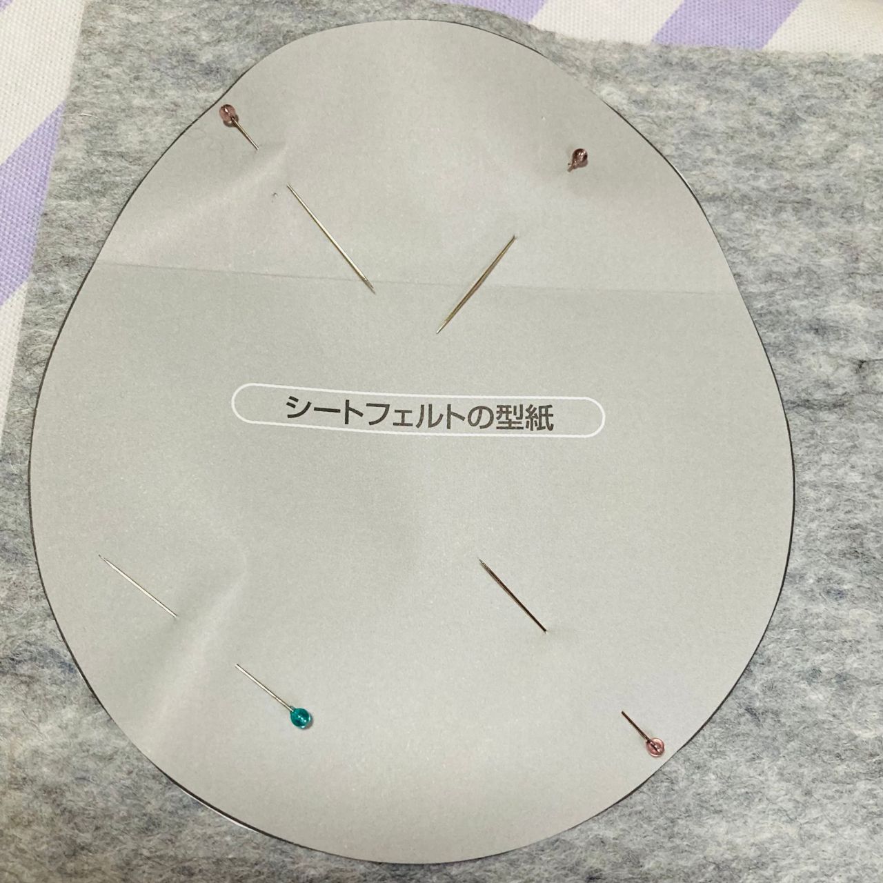 2.あらかじめ形に合わせてカットしておいた型紙を、シートフェルトに乗せて待ち針で留めてカットします。