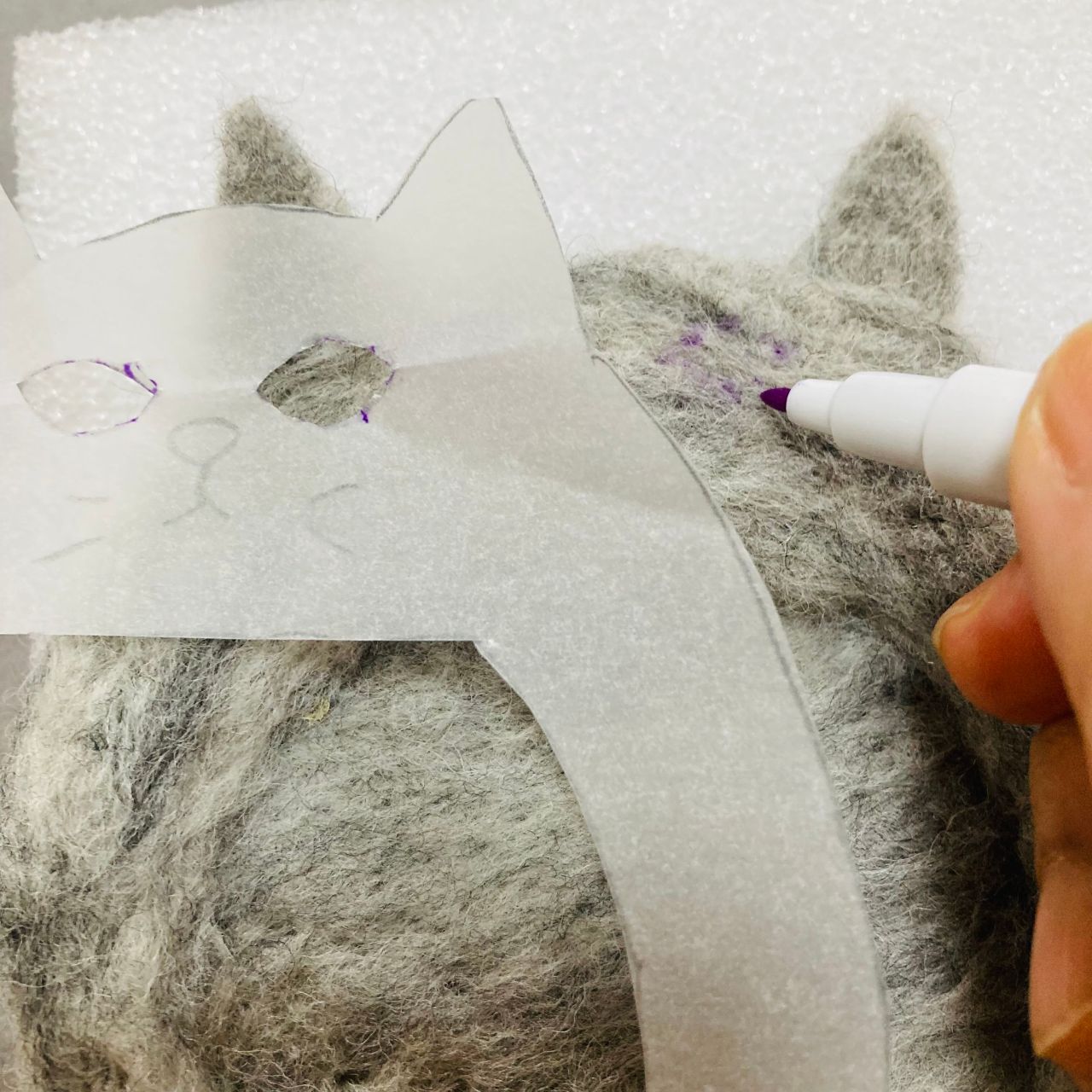 4. フェルトシート表面と続けて耳もつけたら、次に顔を作っていきます。