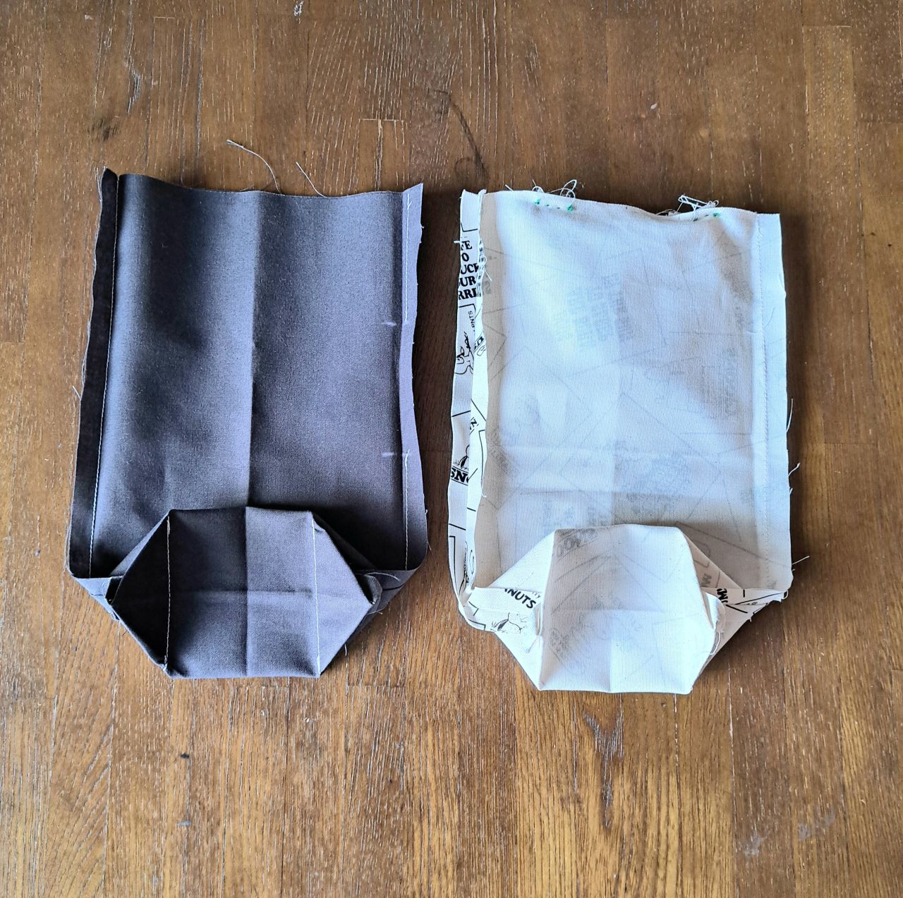 ⑤表側、裏側それぞれのそこを三角に縫い、マチを作ります。