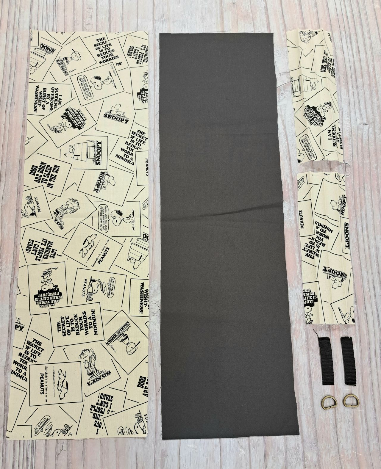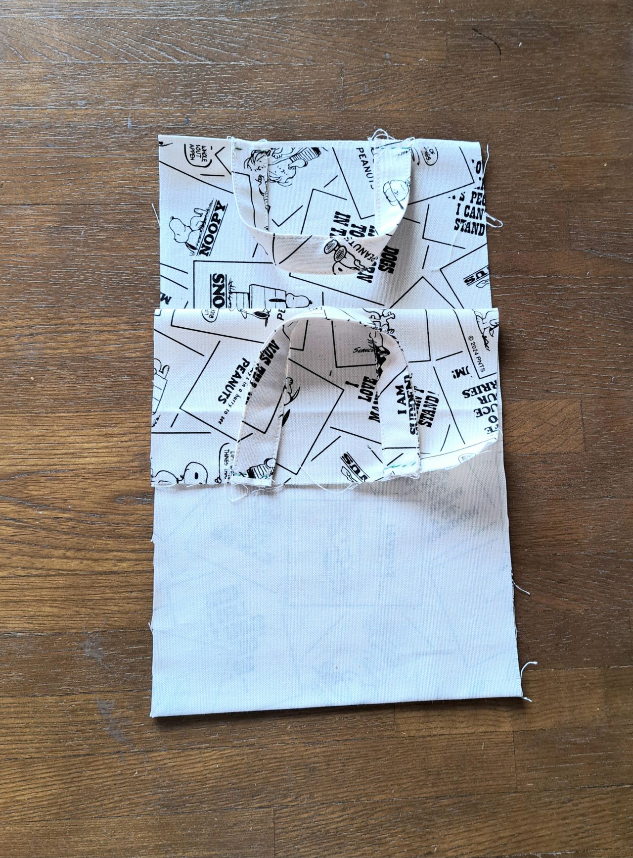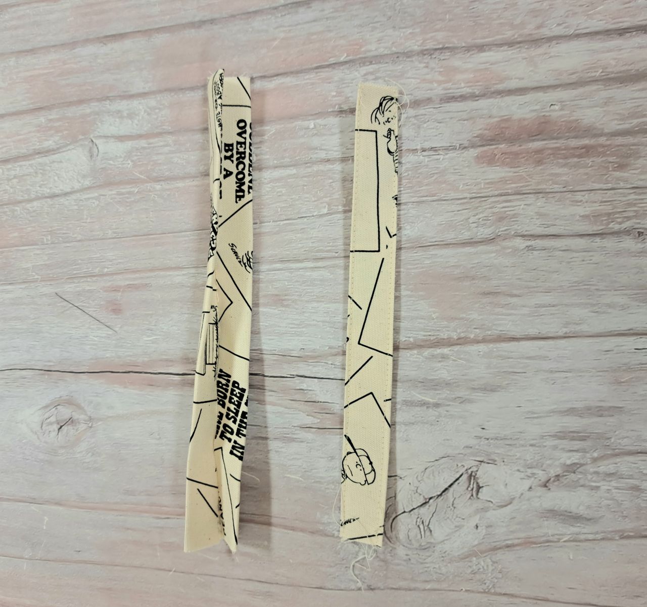①まずは、持ち手を三つ折りにして、サイドをミシンかけして用意します。