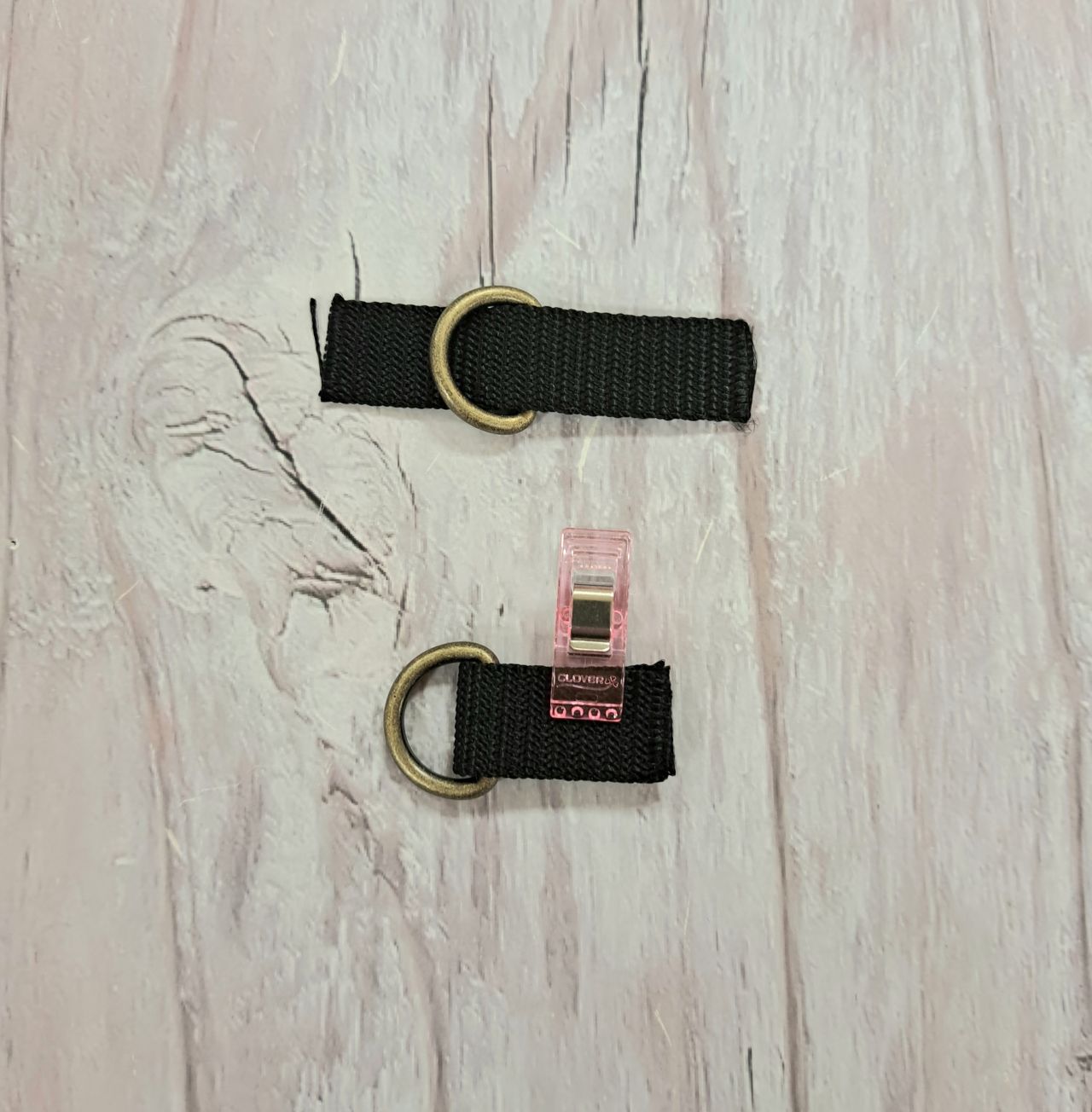 ⑥表側、裏側を中表にして合わせます。この時、用意していたDカンをセットして、上辺を縫います。