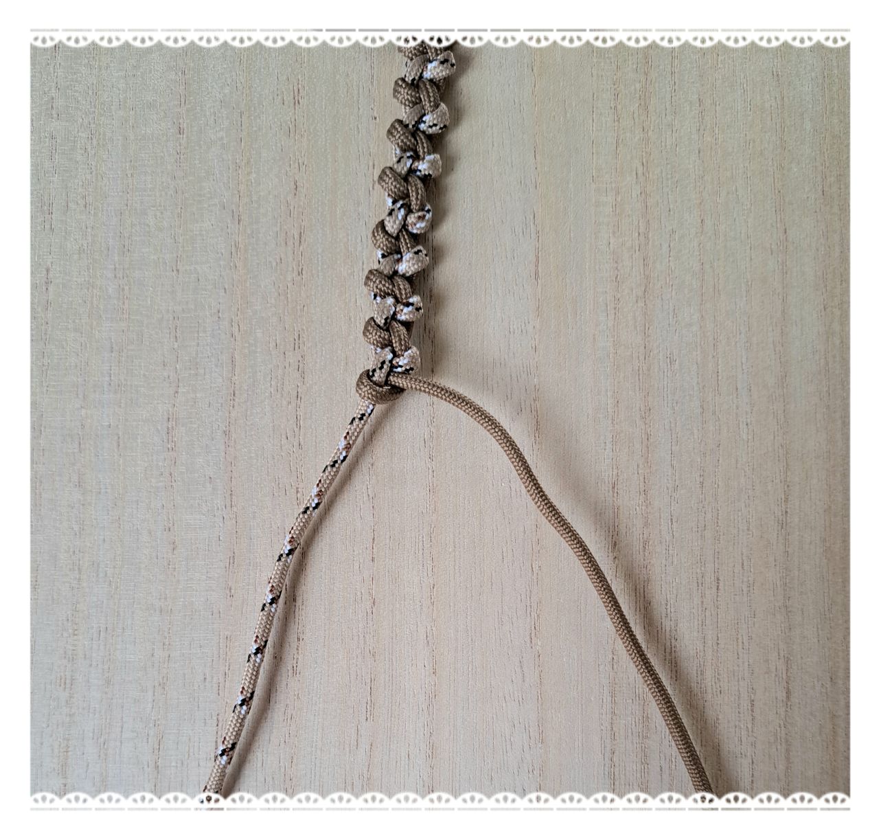 ②長さが結び終わったら、ひも端を金具に通し結び目から3cm離して折り返します。