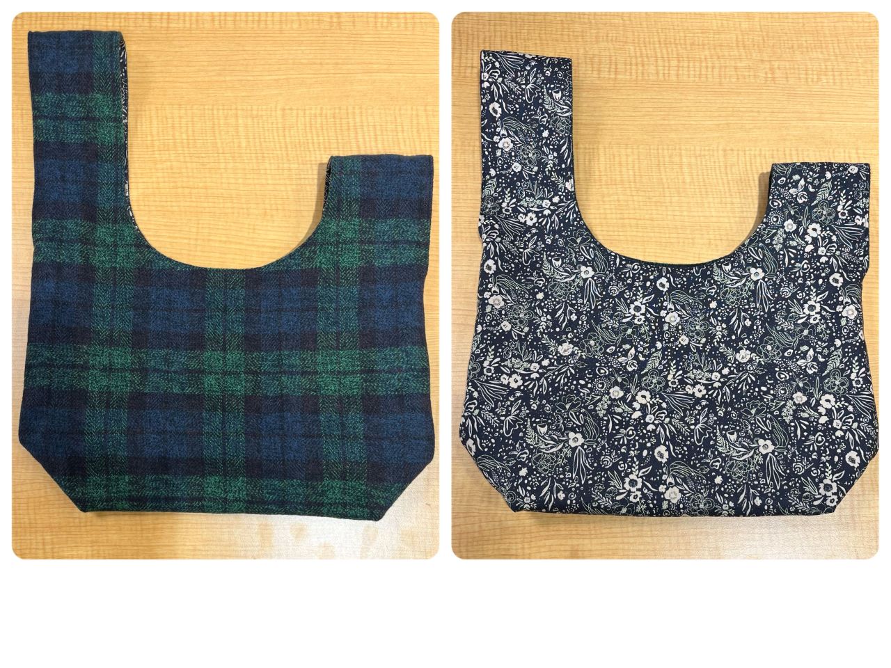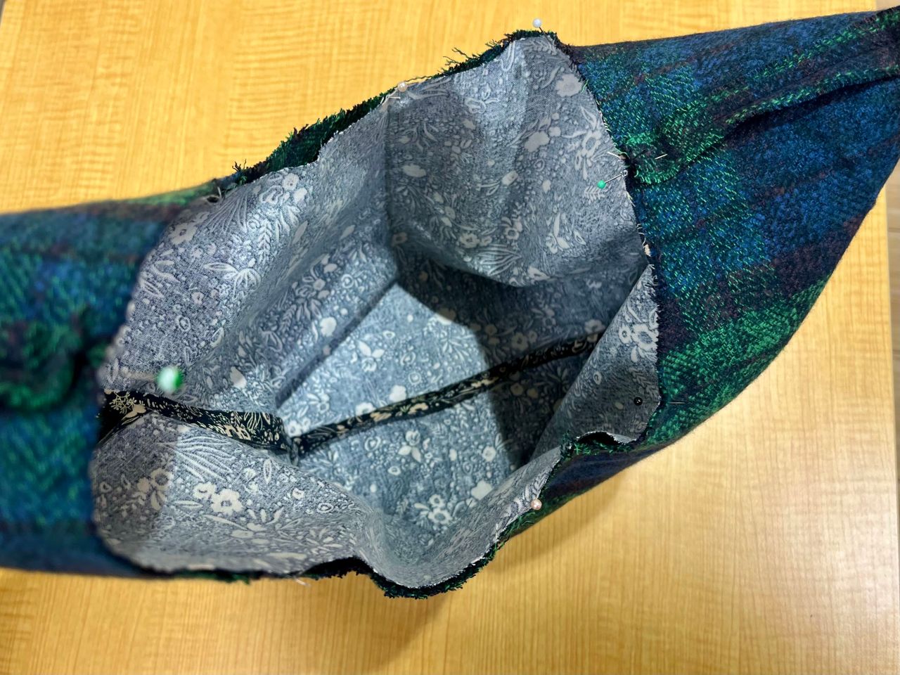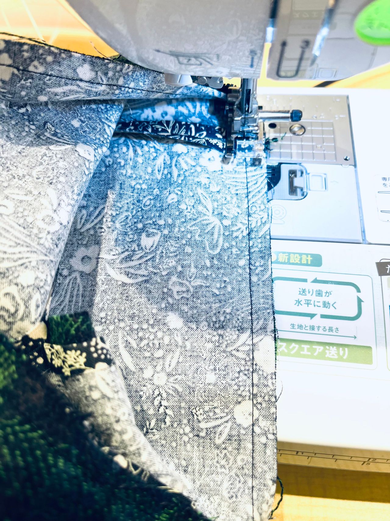 ④脇のあきから表に返して、袋口と持ち手にステッチをかけたら完成です‼︎