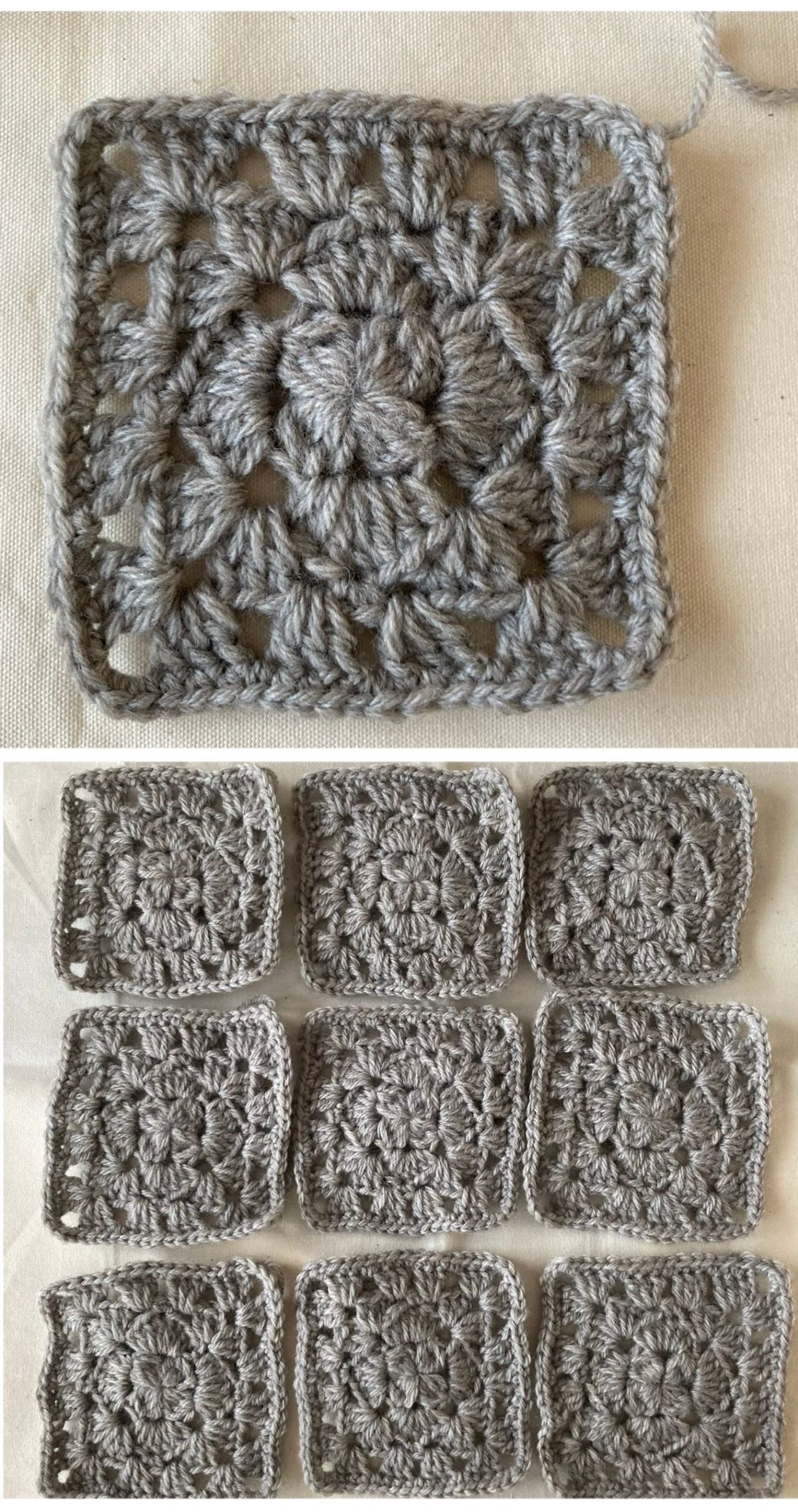 ①中心から編み始めて四角形のモチーフを9枚編みます。