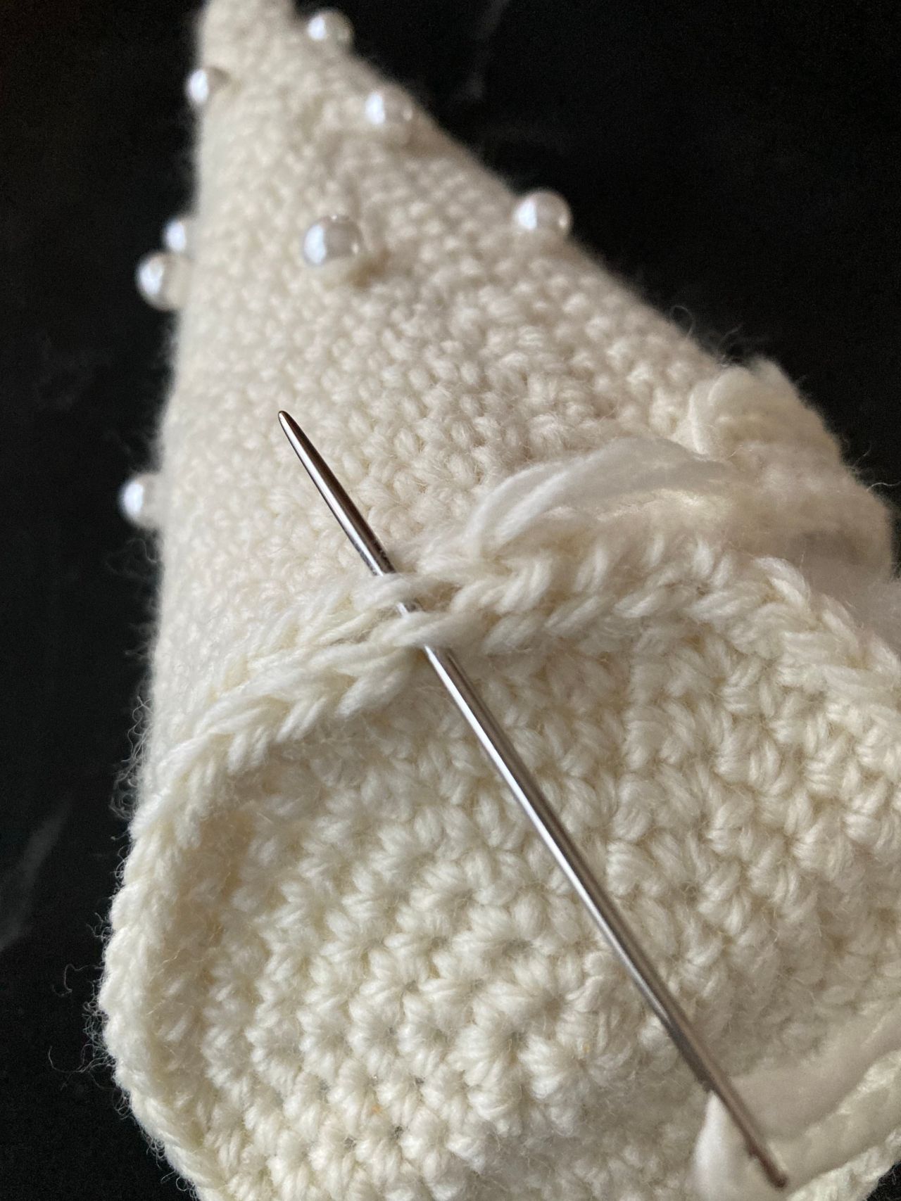⑦本体に綿や余り毛糸などを入れ、底を半目の巻きかがりでつけます