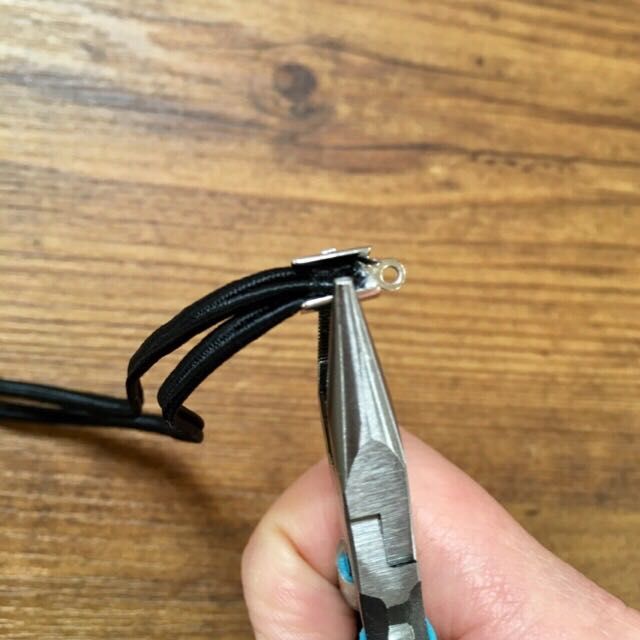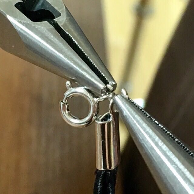 革ひもキャップにボンドをちょこっと塗り、コードを挟む。