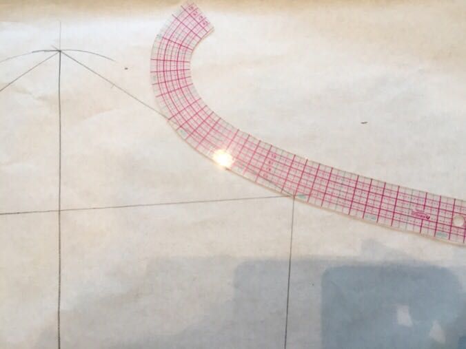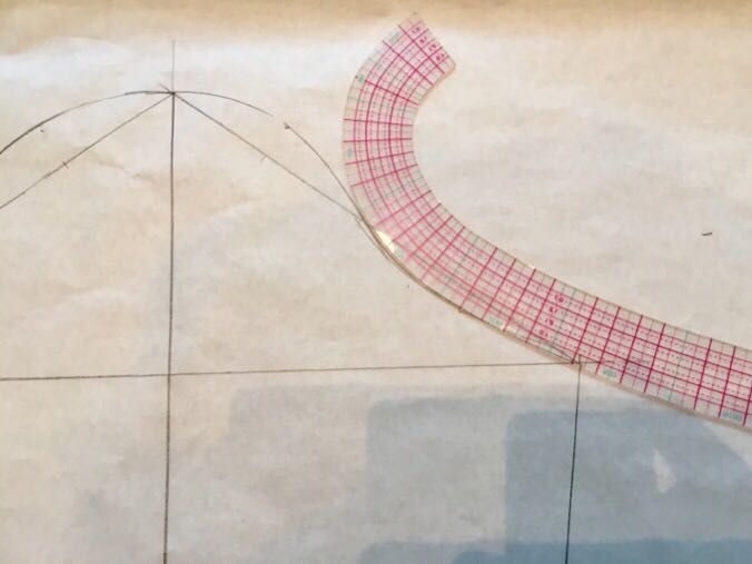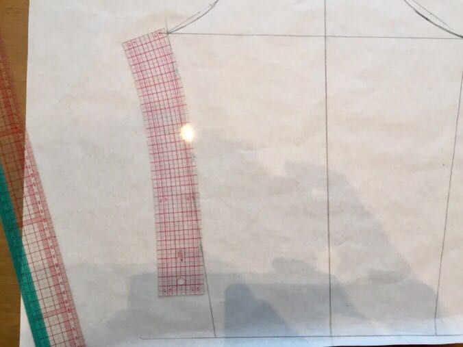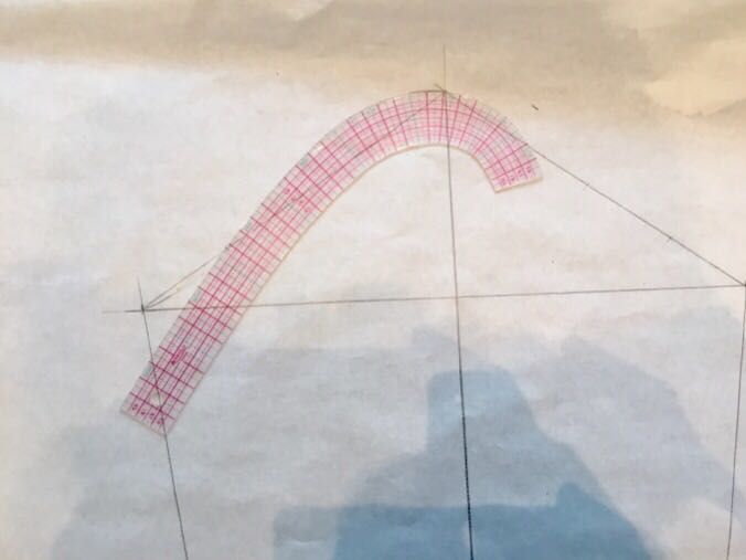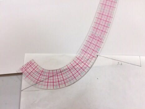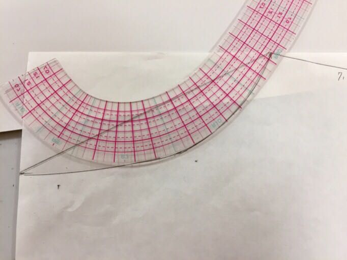 ⑤袖山点から脇の直線を4等分し袖山点から一番近い所に指定の長さのポイントを決め、カーブ定規でポイントを通るようにラインを引く。