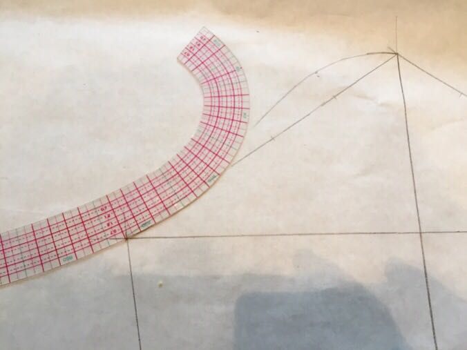 ①指定の長さの直線を結び、肩線、衿ぐり中心を決める。カーブ定規を使ってポイント点を通るようにカーブを作る。