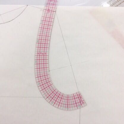 ②アームホールも肩線から脇のポイントまで直接を引き、指定の長さを通るポイントを結ぶようにカーブ定規を使ってラインを引く。