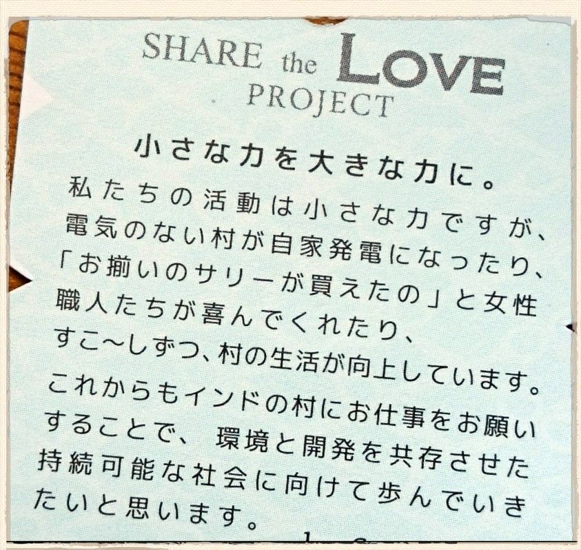 インドの職人と日本のデザイナーで作られている商品です。一つ一つの商品のパッケージの裏にはその思いが綴られています。