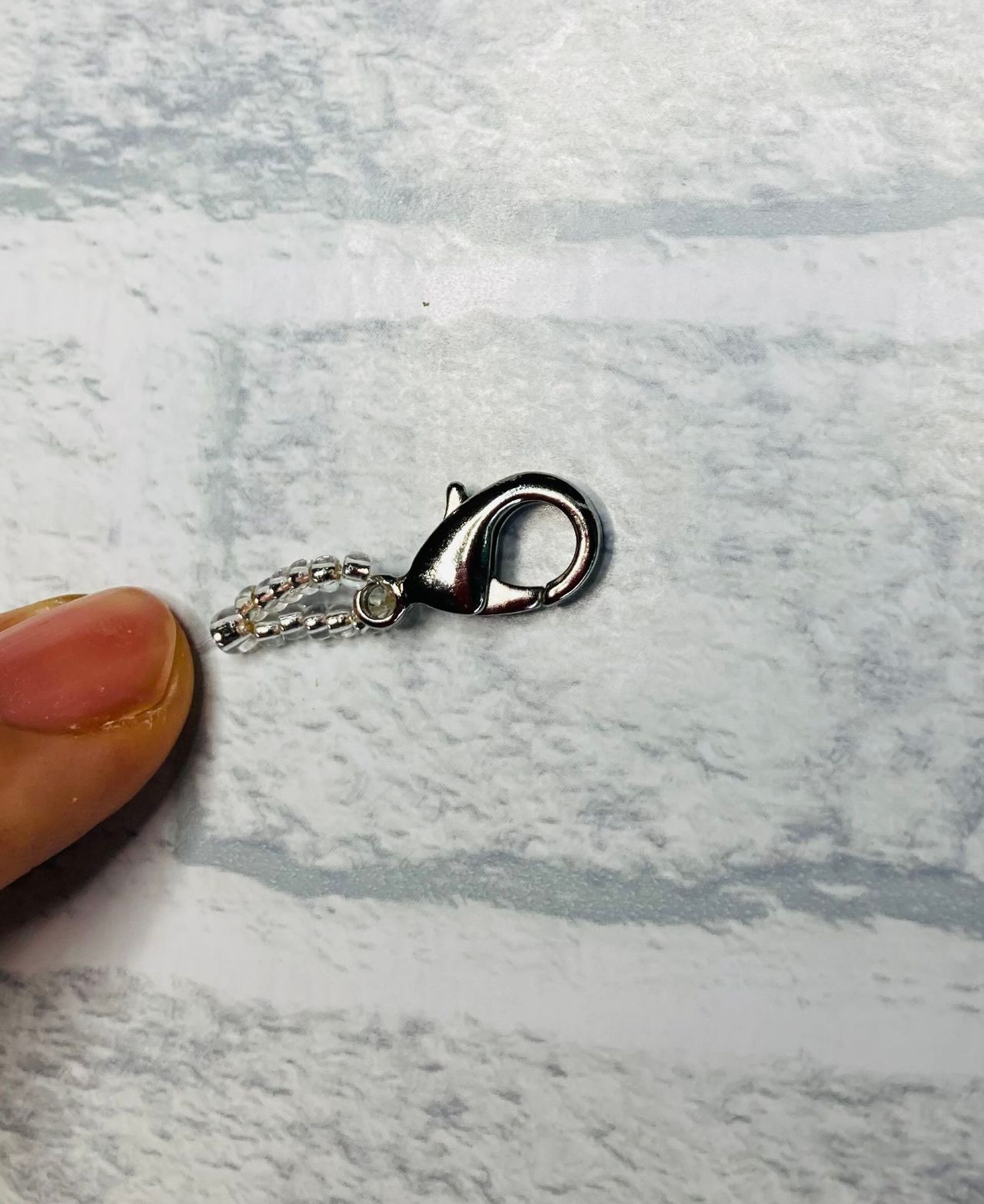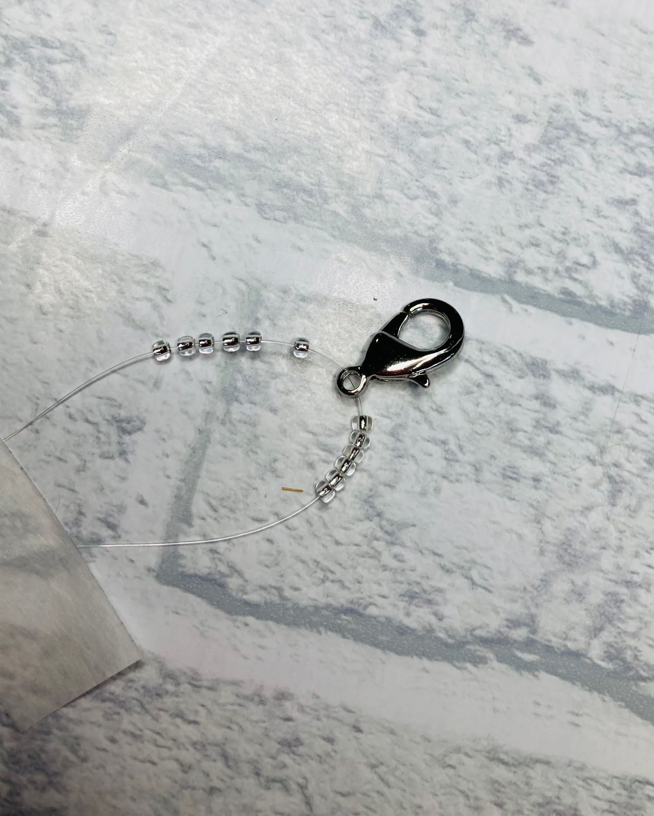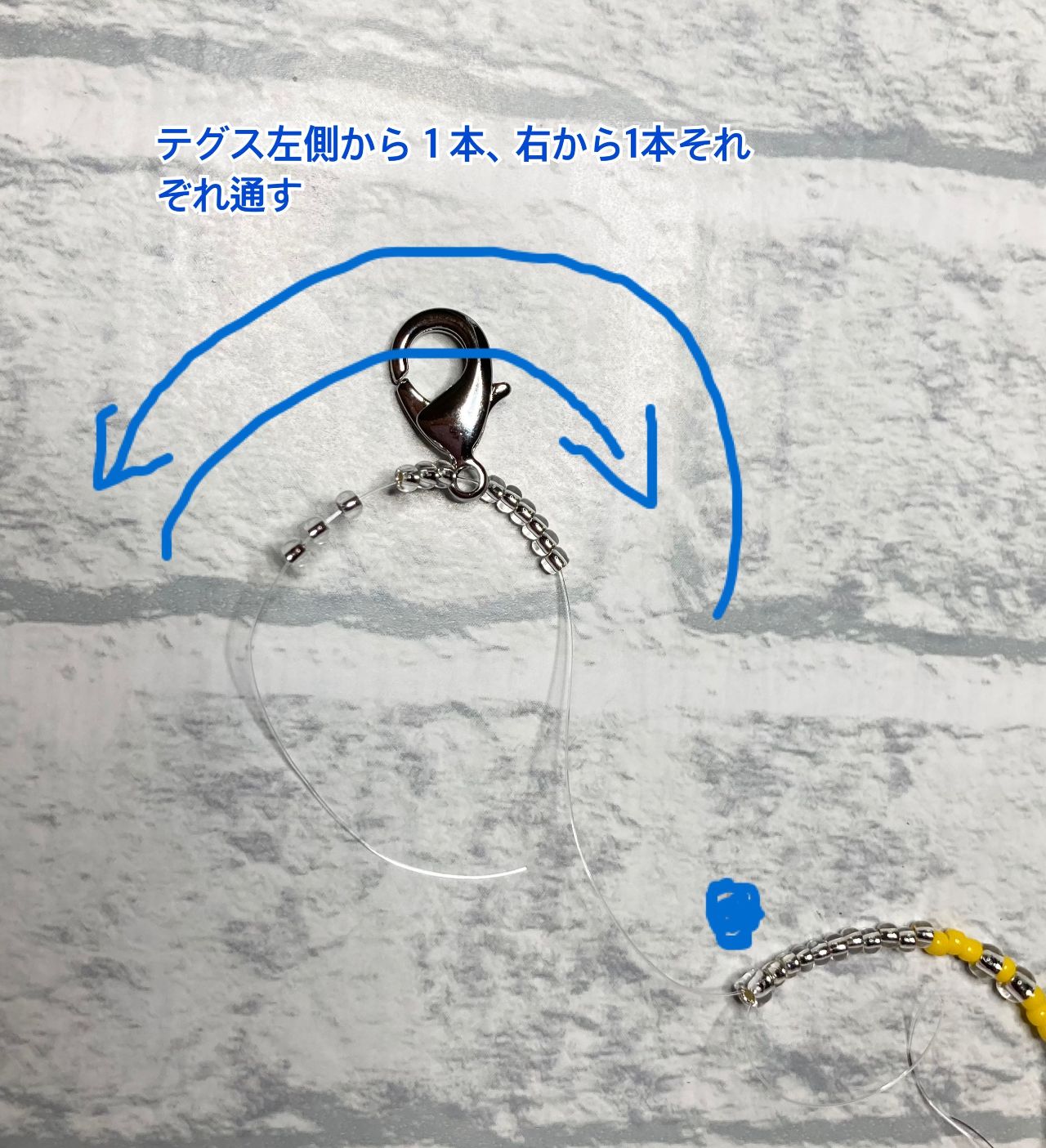 片側のテグスからビーズを6個通しカニカンを通し、次に再びビーズ6個を通しテグスを優しく半分に折った中央あたりに配置する。