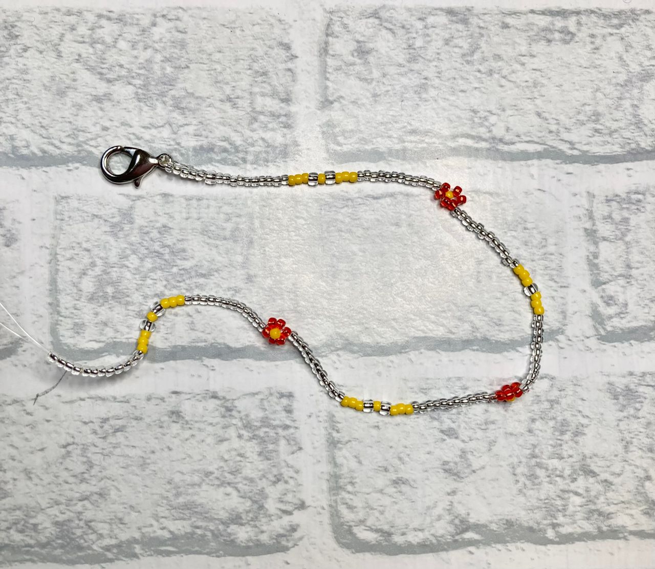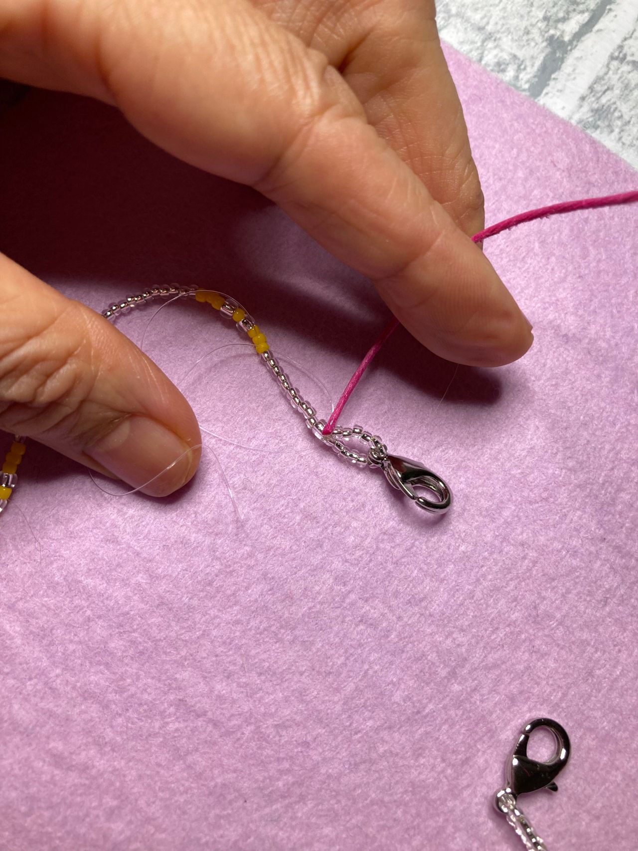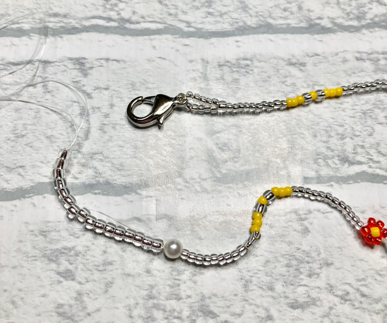 7. 花の後引き続き(4.)と同様にビーズを通していく。写真のようにコード部分、花、コードの順でビーズを通す。