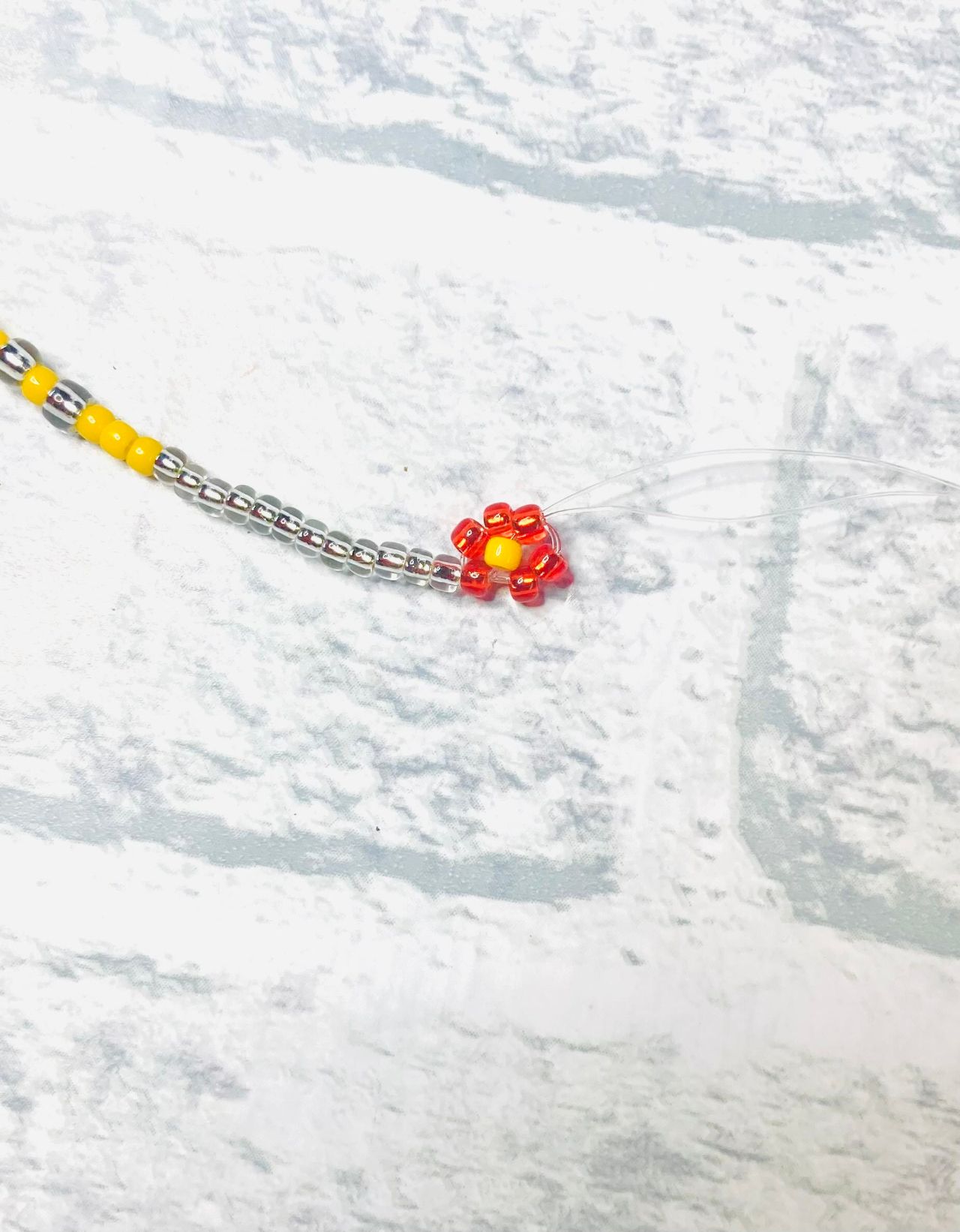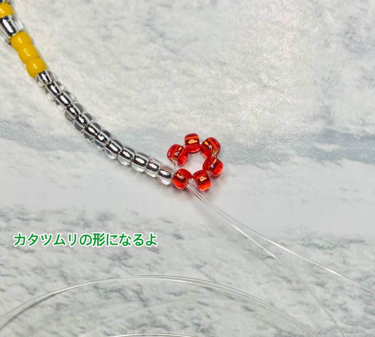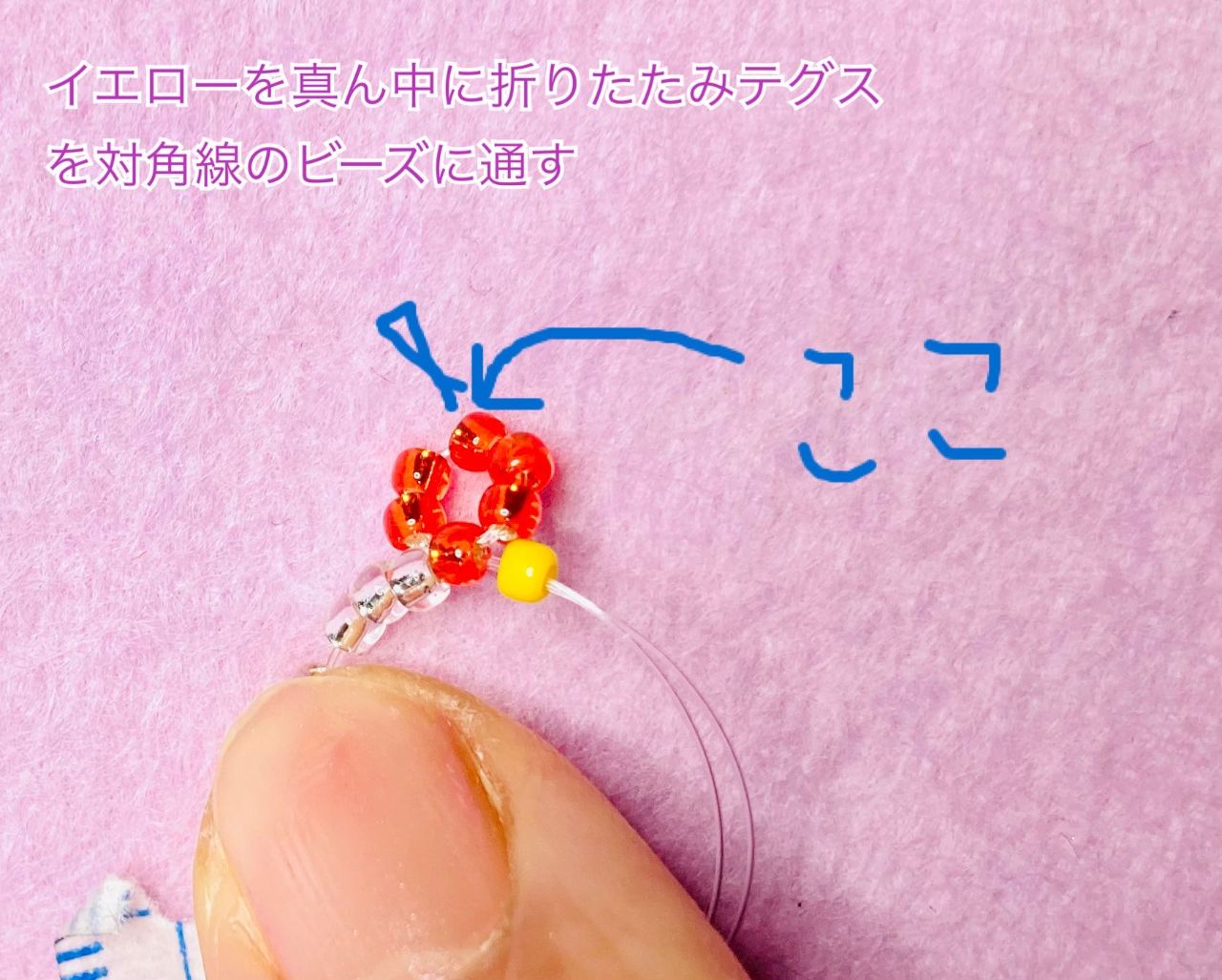 6. イエローの丸小ビーズを通してから真ん中に折り畳むように入れて、テグスを対角線となるレッドビーズに(三角マーク)の位置に左から右へ、ビーズ赤1つを通してテグスを引くと花ができる。