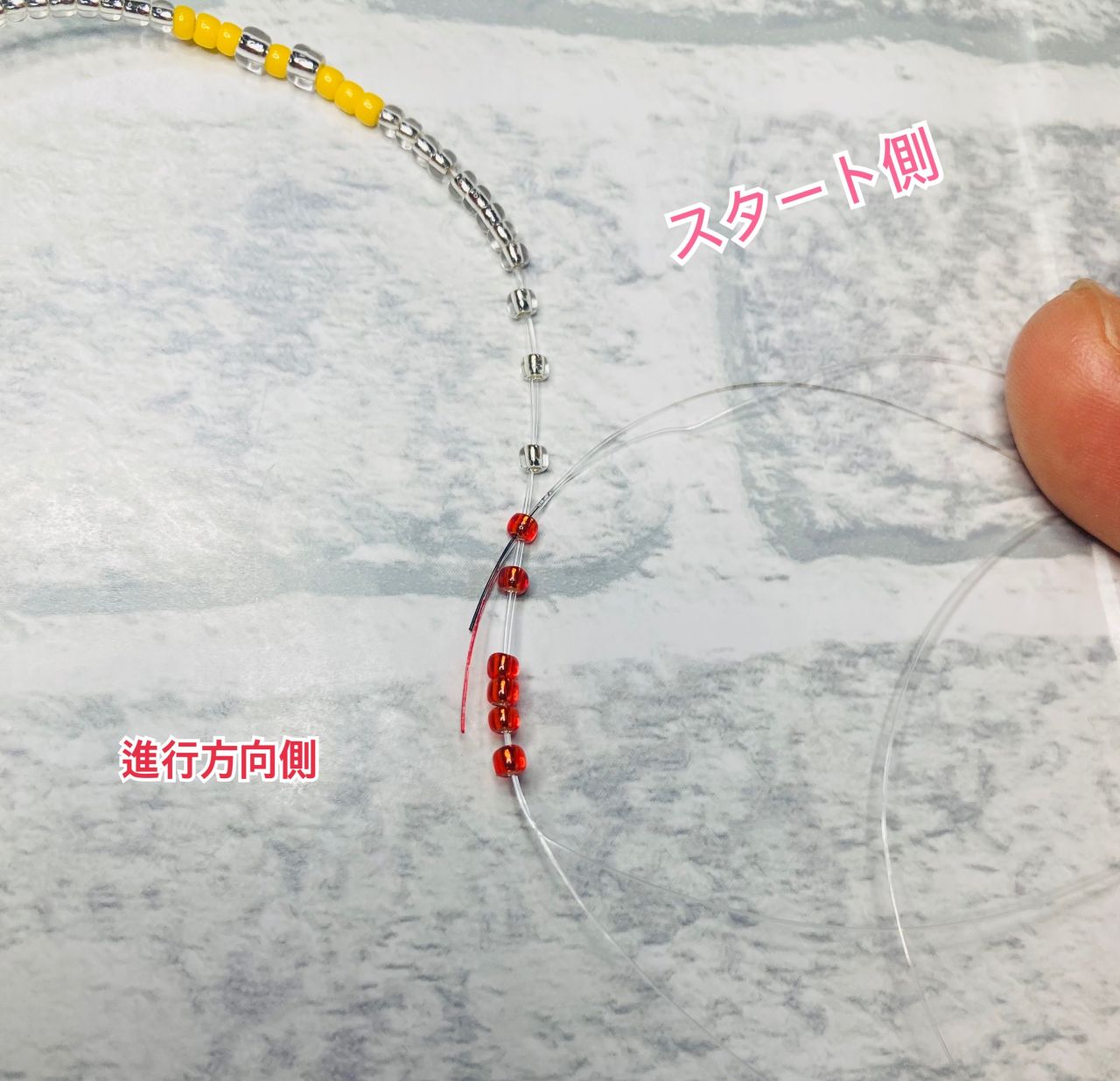 5. テグス2本一緒にレッドのビーズ6個通してレッド1個目のビーズにスタート側から通して優しくテグスを引いて丸の形にする。