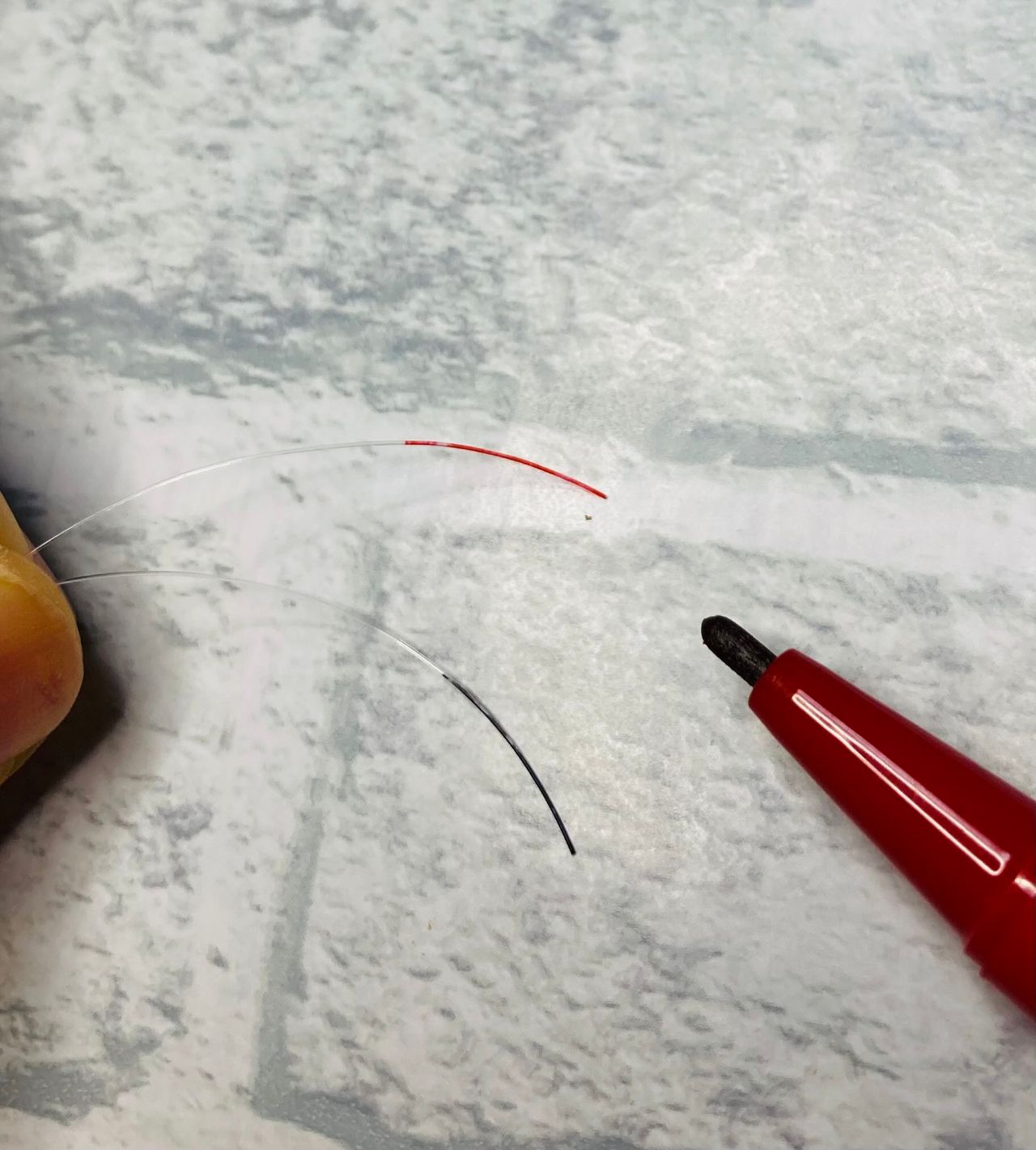 1.テグスを2mにカットして作業効率アップするため先端を油性マーカーで色をつける。
