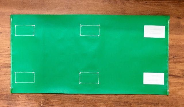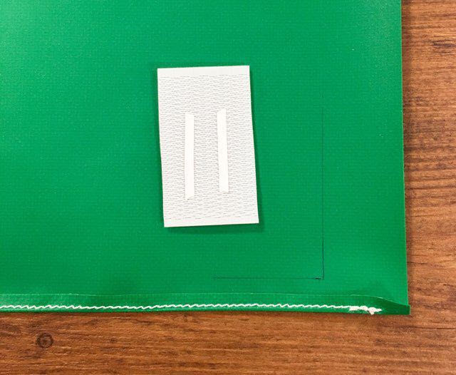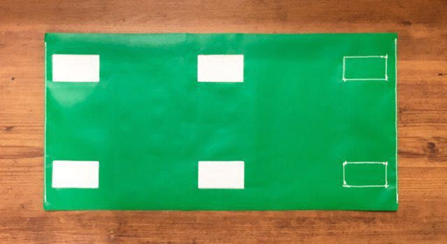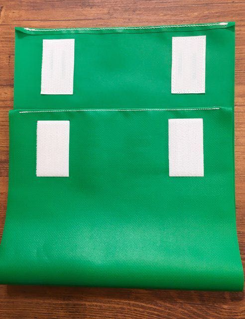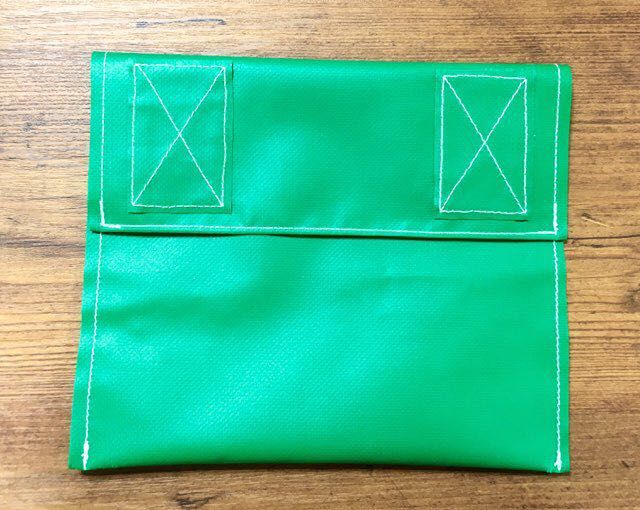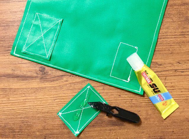 ターポリンの余ったところを画像のようにカットしてステッチをかけ、強力多用途ボンドや両面テープで貼るだけ♪