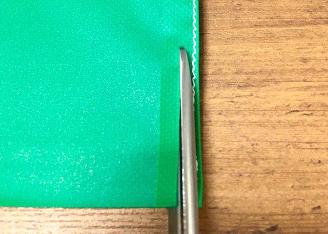 端から2mmのところにステッチをかけ、縫い目ギリギリで両面テープごと縫い代を切り落とす。