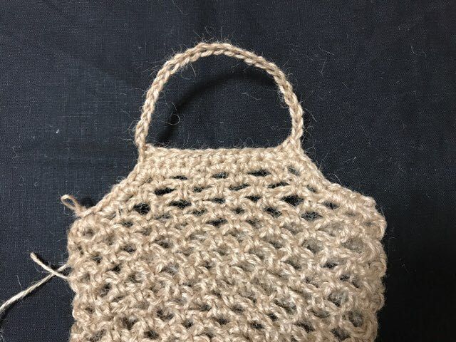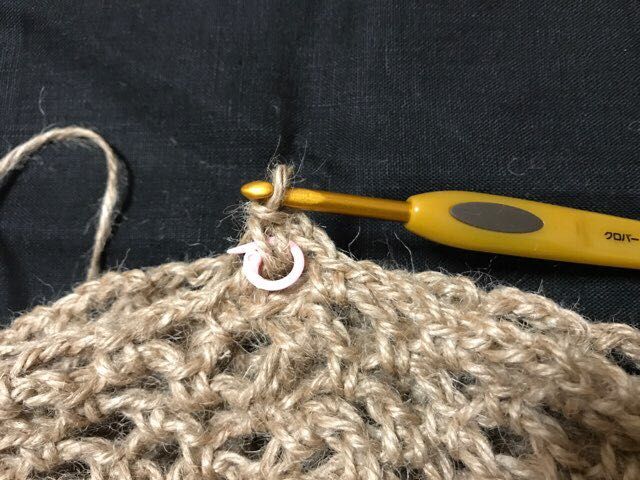 脇に糸を付けて、細編みで目を拾い、持ち手になる部分はくさり編みし、ぐるっと1周編み、持ち手部分の芯を作ります。