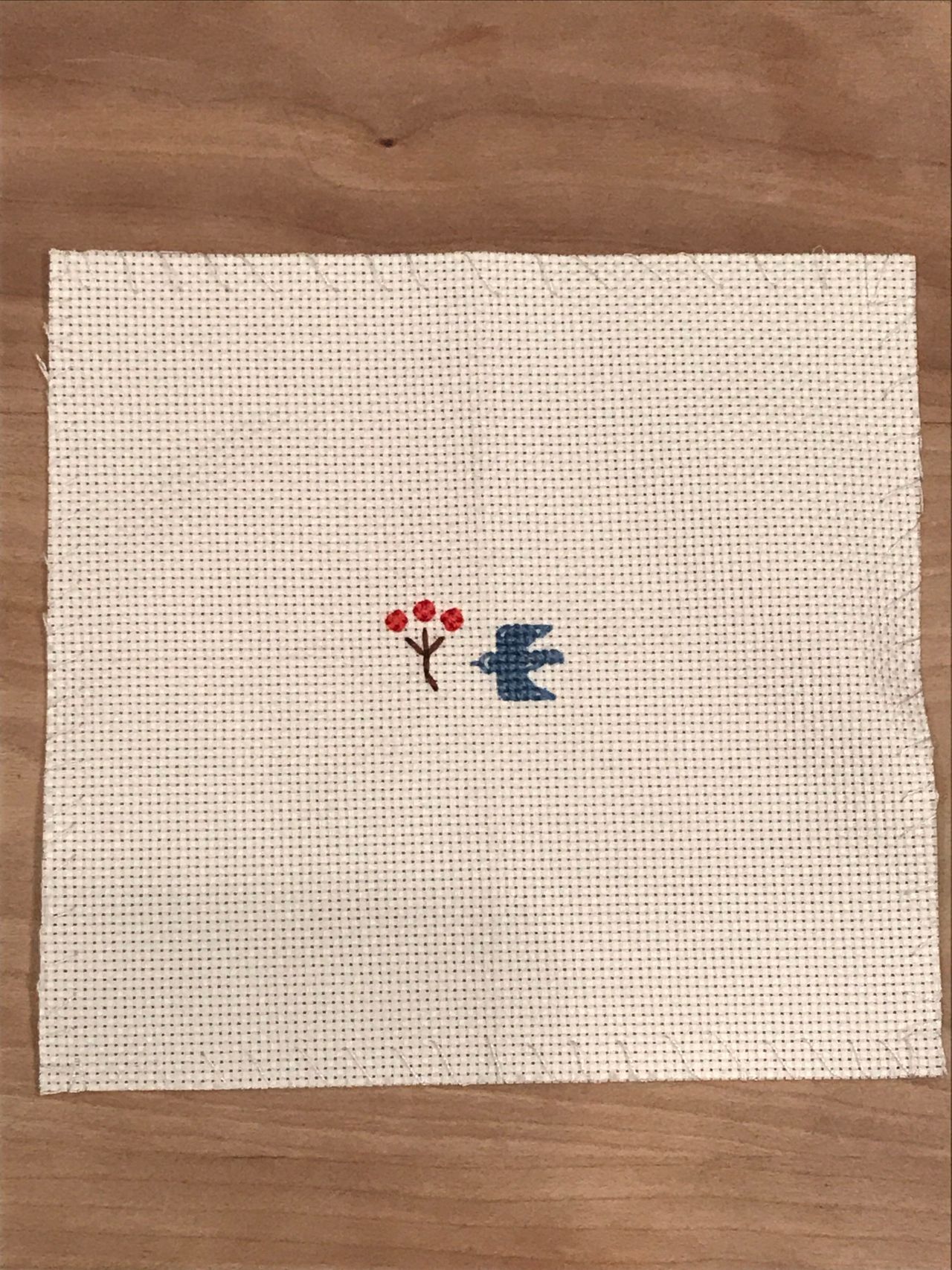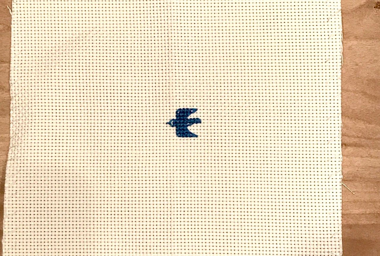 ②刺しゅうは中心から始めます。青い鳥の下の羽根のところからスタート!