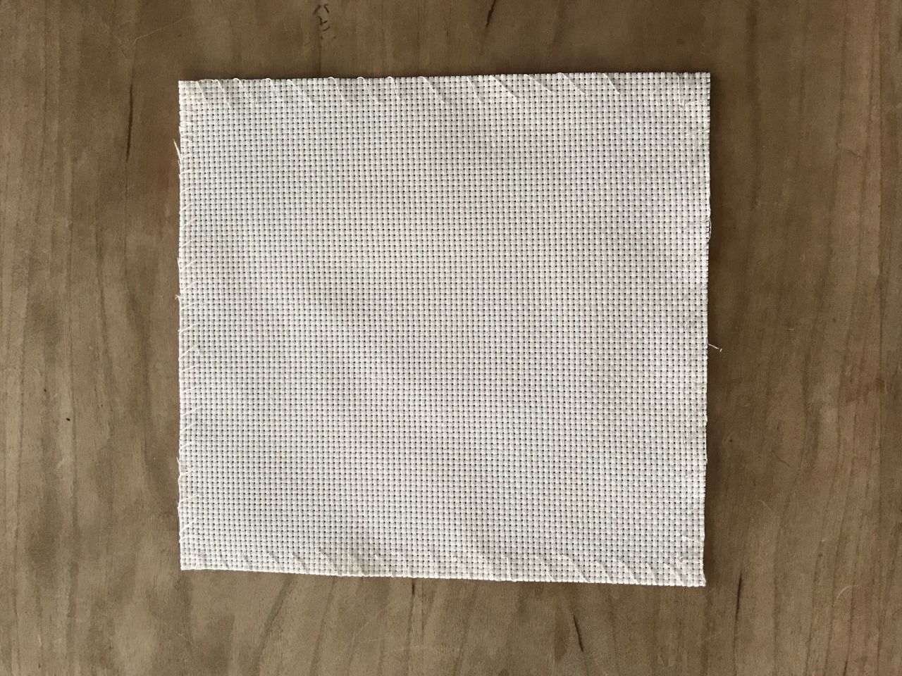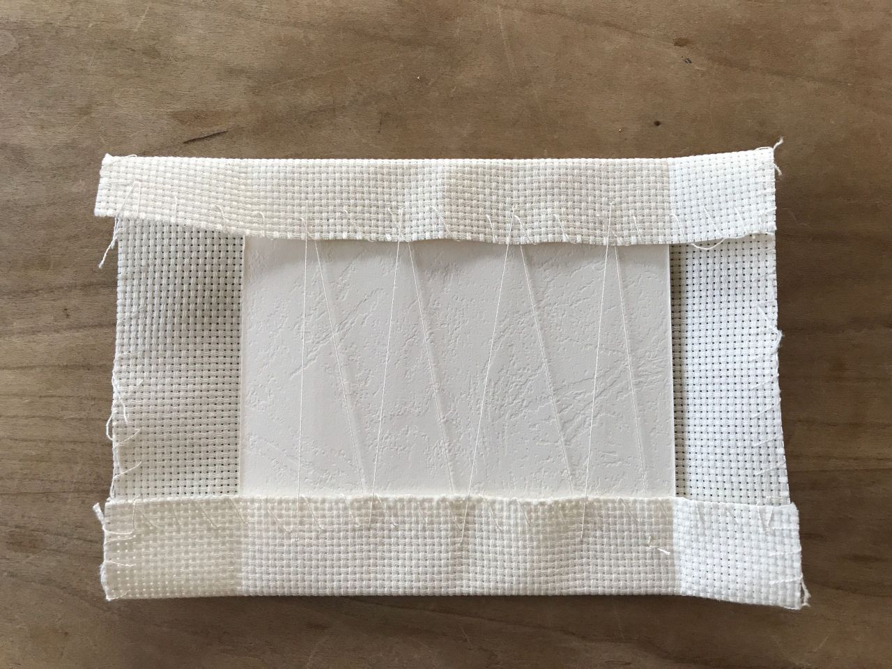 ④刺しゅう布を裏にし、厚紙を上に置いたら布がたるまないように縫い糸かセロハンテープでとめます。