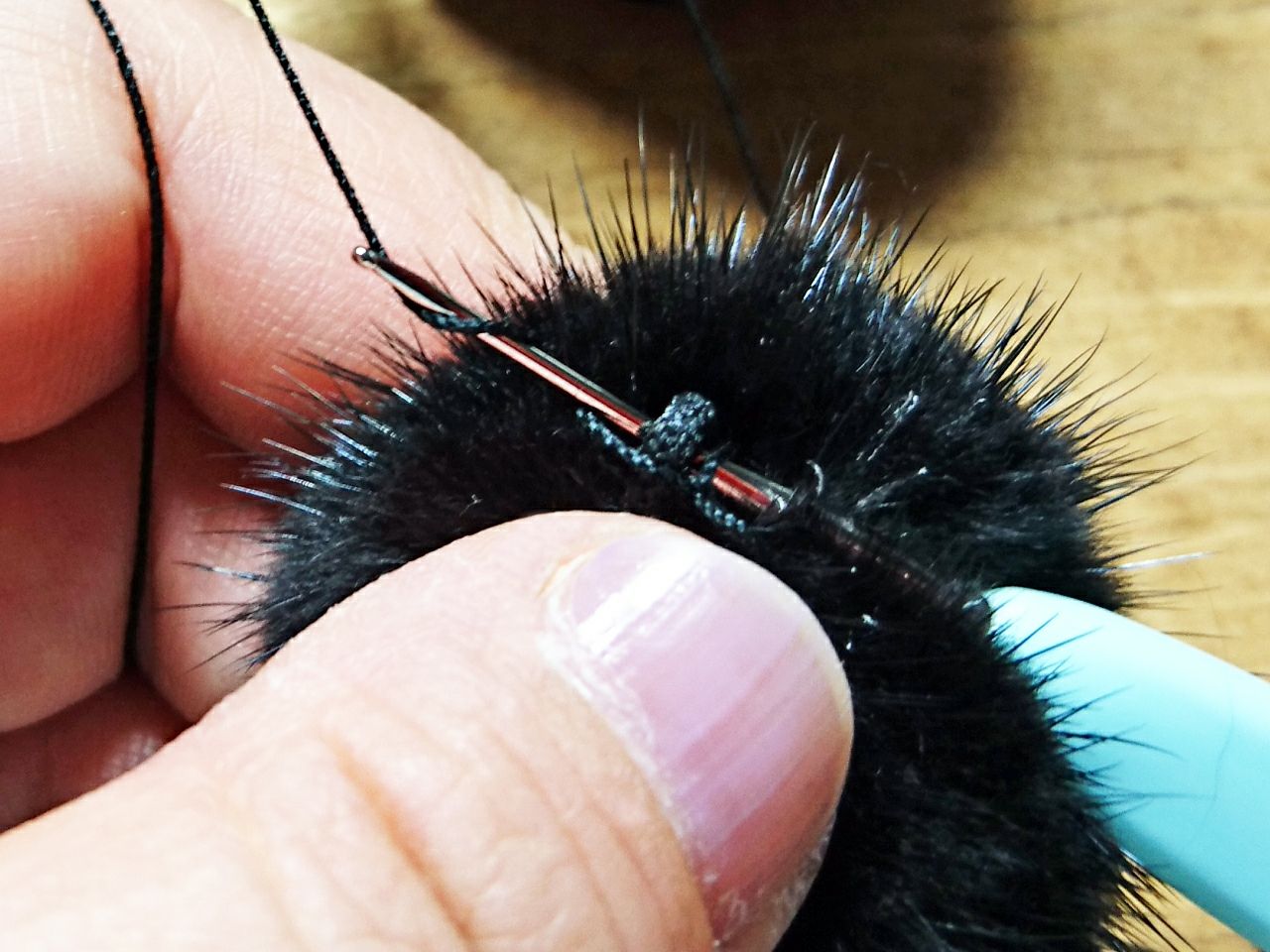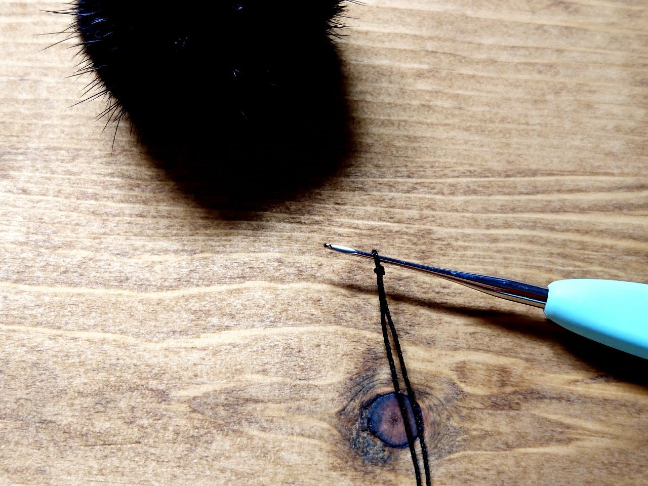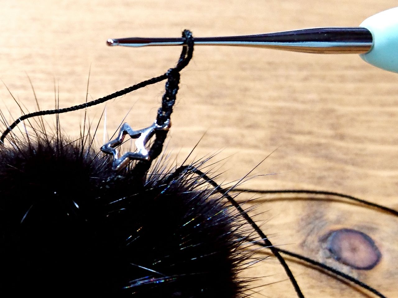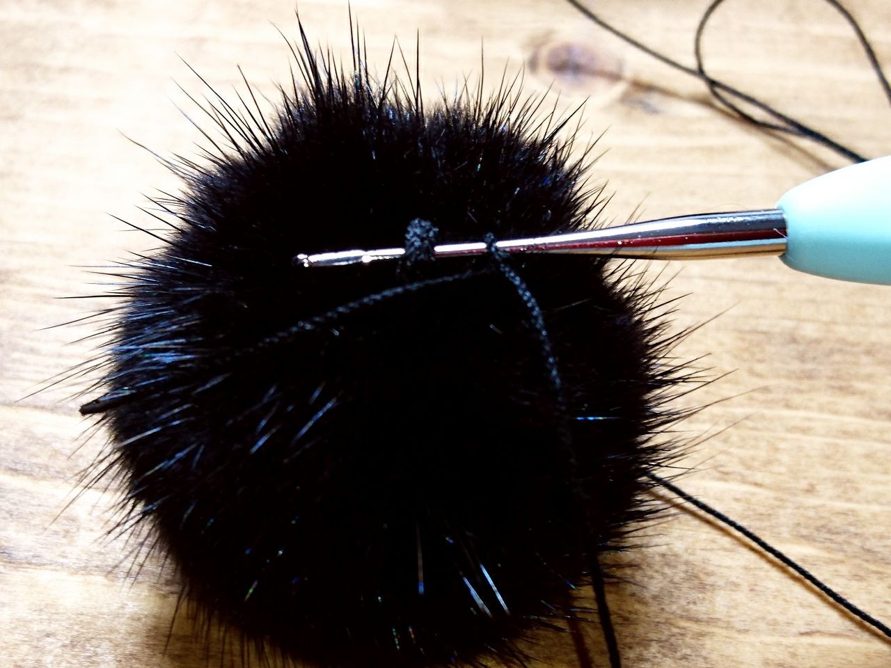レース針を入れたままミンクポンポンのループに針を入れ、