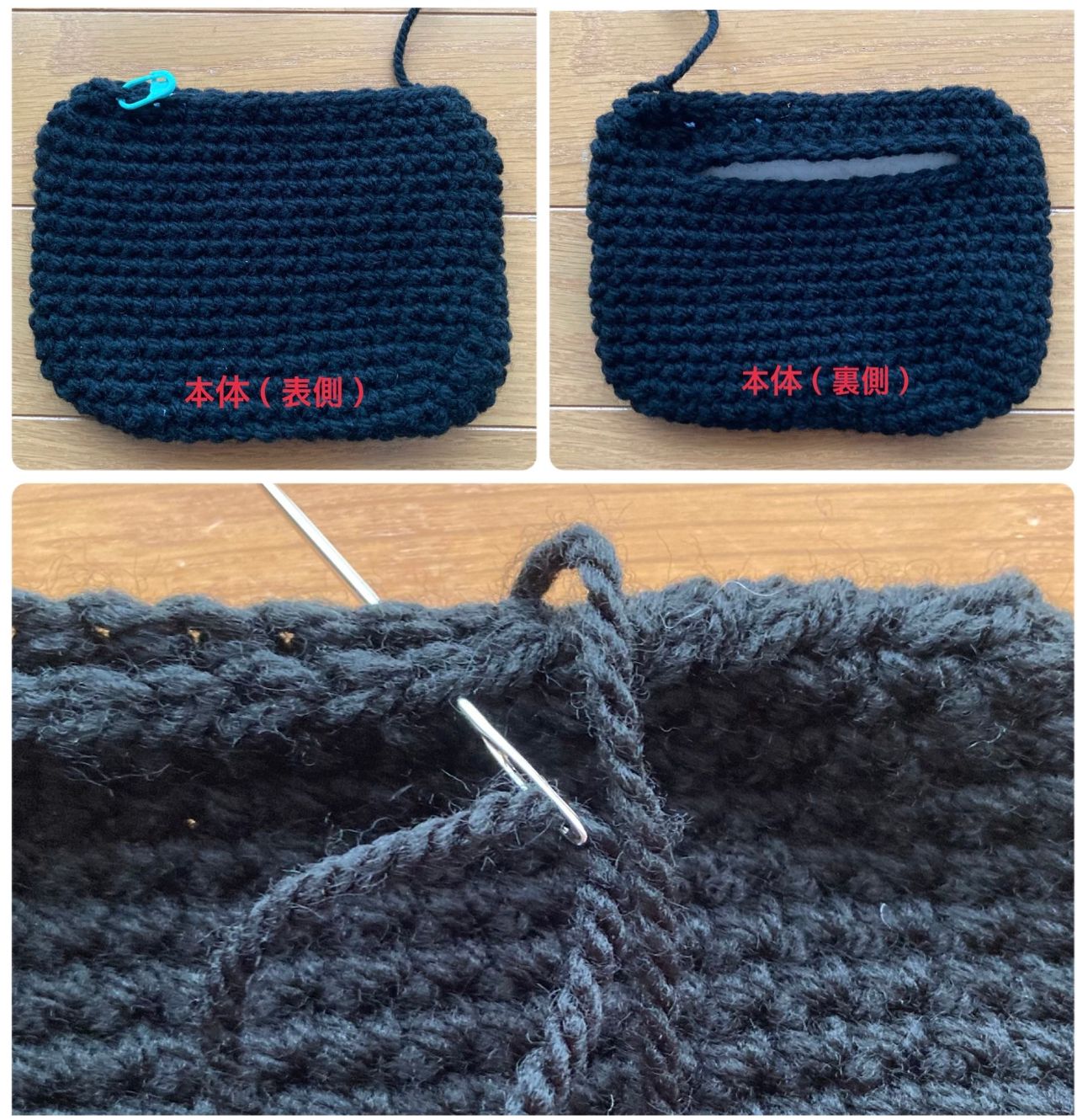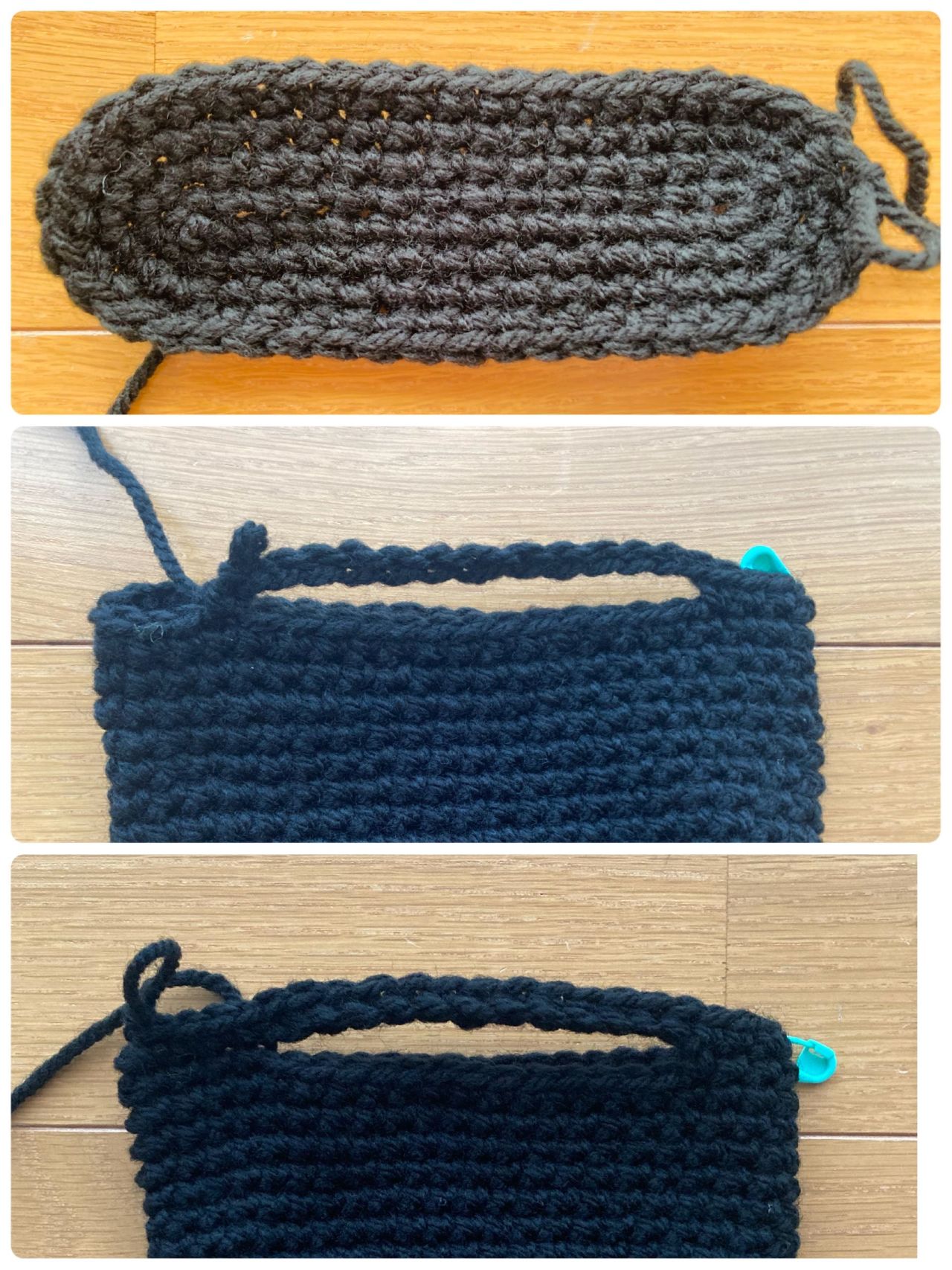 ①くさり編み14目から編み始め、細編みで楕円形の底を編みます。