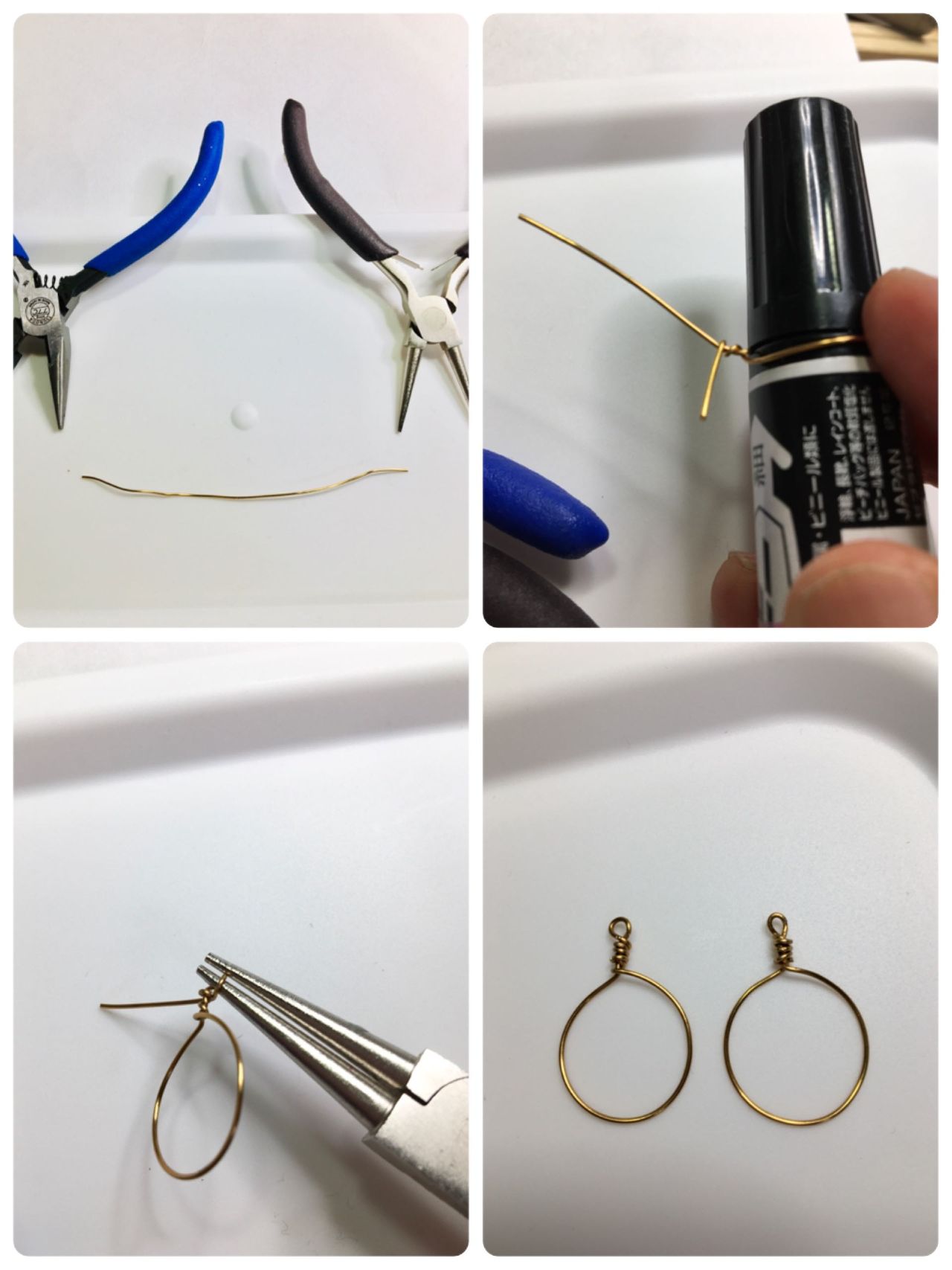 22番ゴールドのアーティスティックワイヤーを10センチにカットして、このタイプのマジックの丸みにワイヤーの切れ端が7対3くらいになるように添って丸め(細いキャップと本体の境目あたり)、ワイヤーの合わせ目を指で押さえてマジックを2、3回まわすとメガネ留めのスタートのねじりが出来ます。