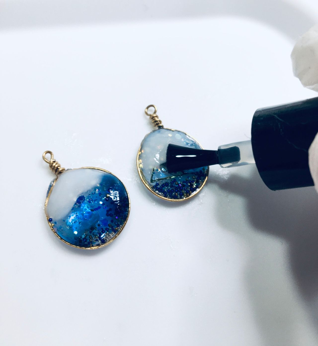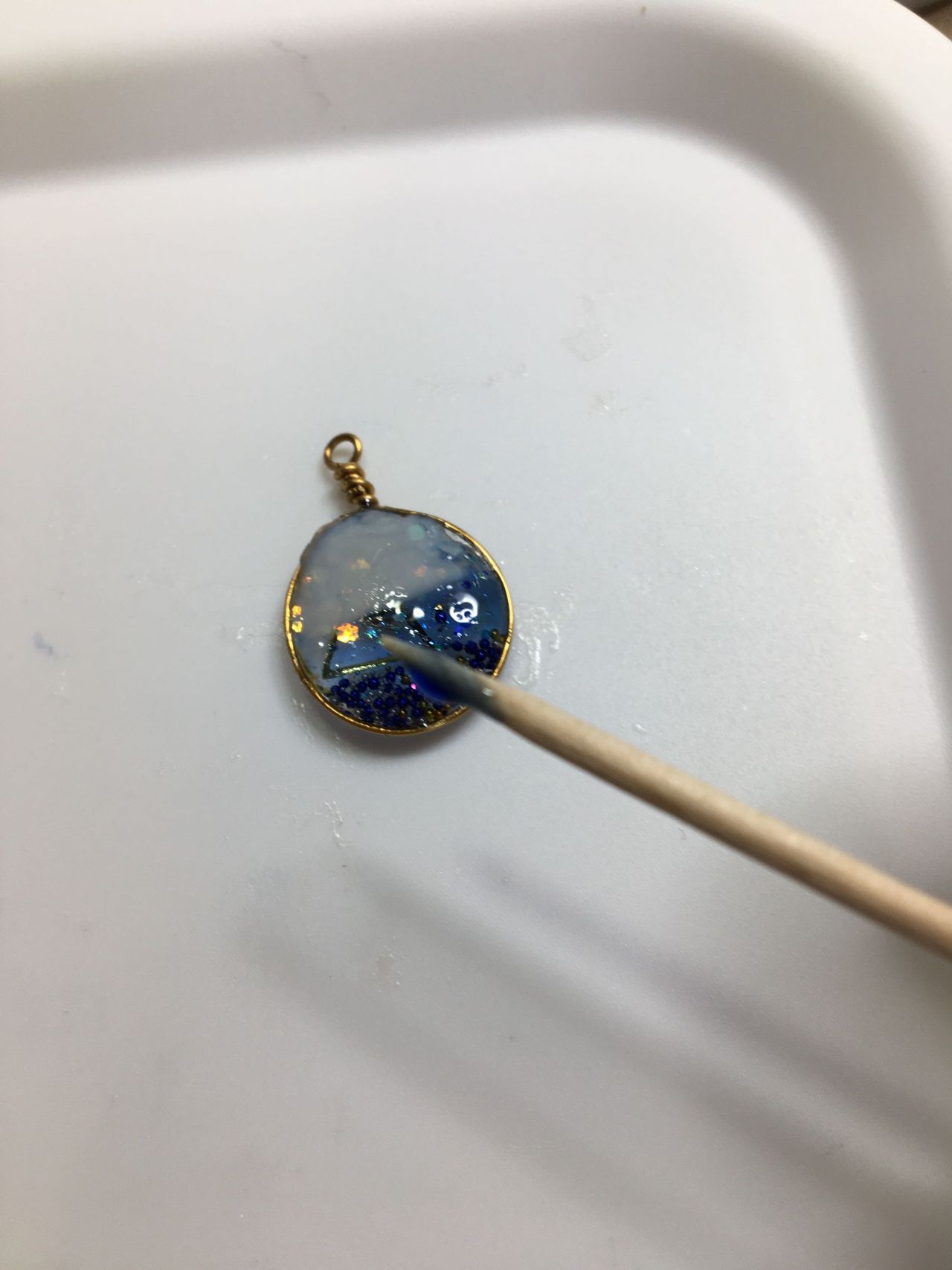 レジン液を薄く流し筆や楊枝などで液を均一になじませ、素早く楊枝やエンボスヒーターで気泡を消します。(この先レジン液を流すたびに気泡を消してから硬化してください)素早くランプを当てる事で液の流出を防ぎます。