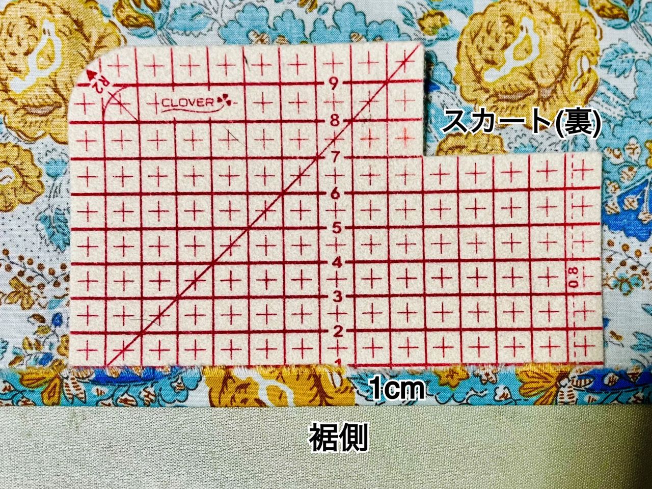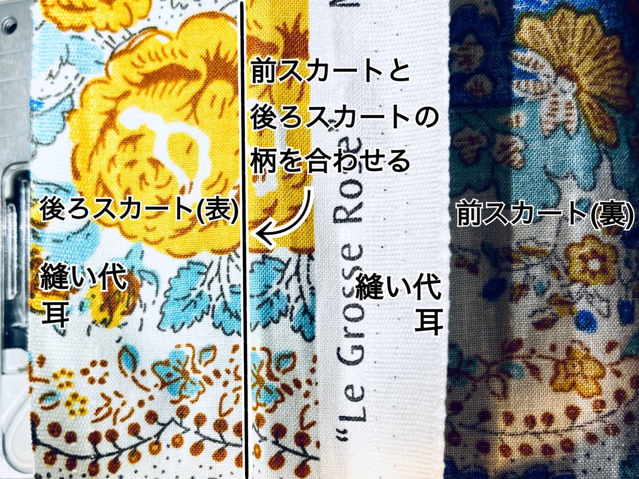 ※前スカートの縫い代をめくって柄が合っているか確認します。