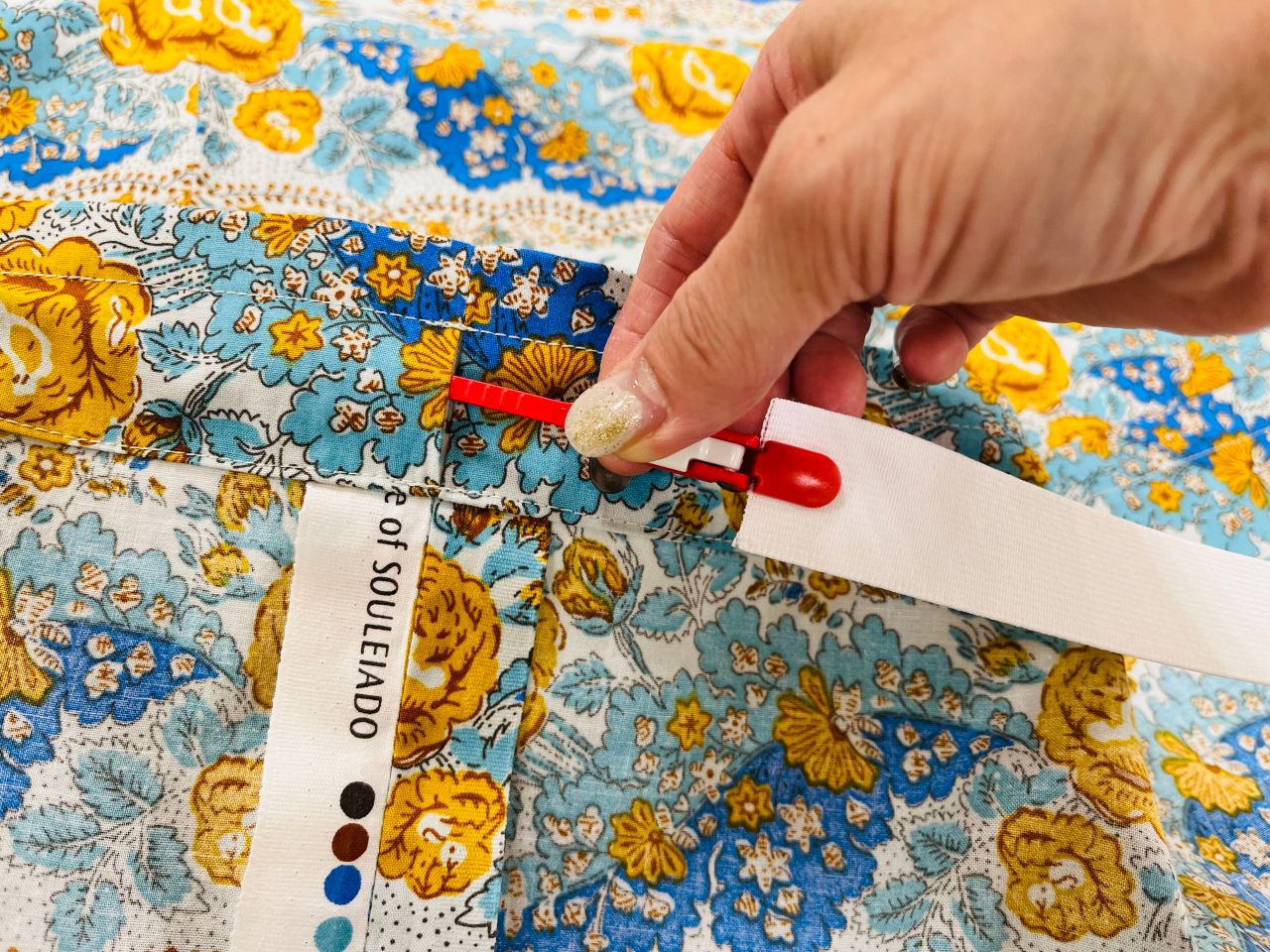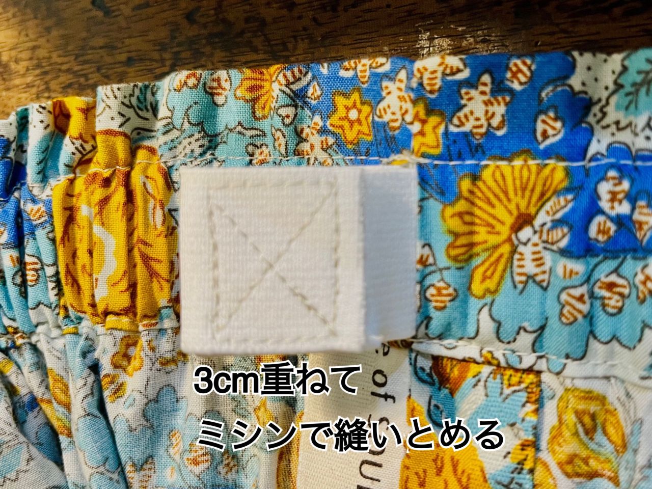 幅広ゴム用のゴム通しを使ってウエストにゴムを通し、ゴム端を3cm重ね合わせミシンで縫い止めます。