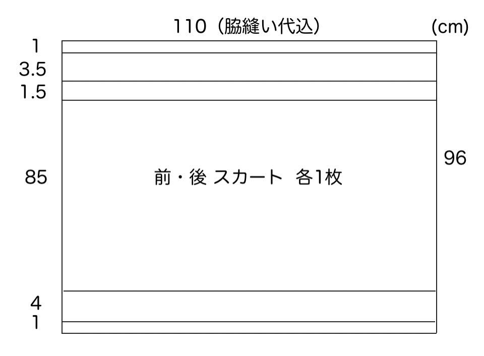 下図を参考に、前スカート、後ろスカート各1枚を裁断します。