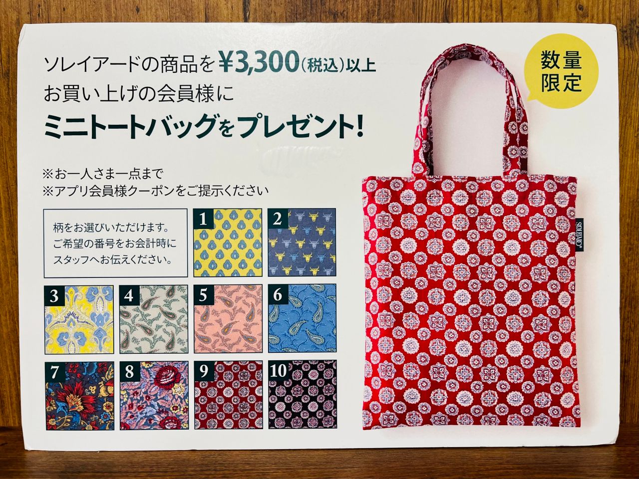 ソレイアード商品を税込¥3,300以上お買い上げで、ミニトートバッグをプレゼント‼︎
