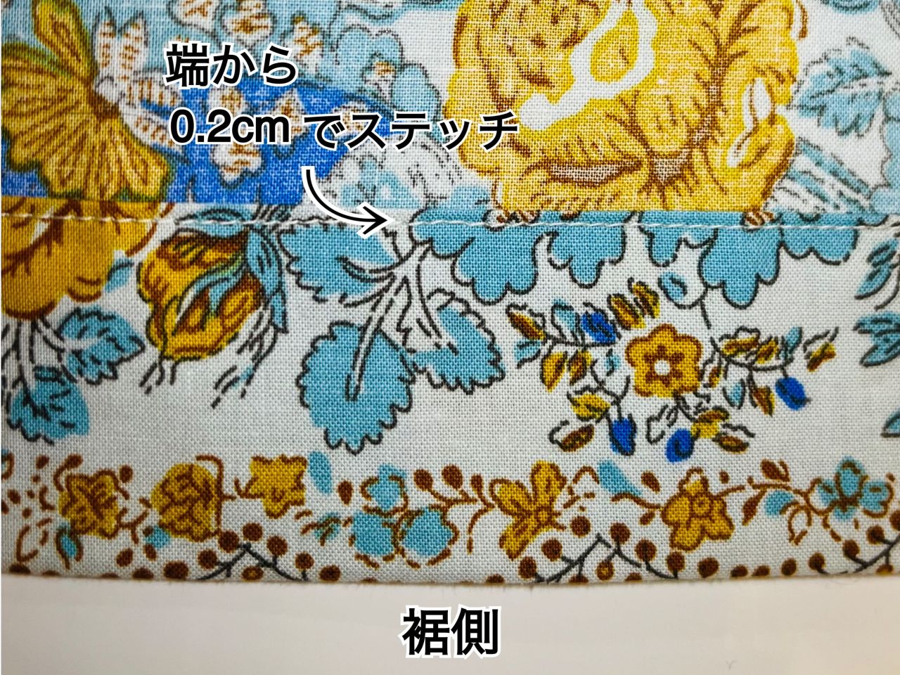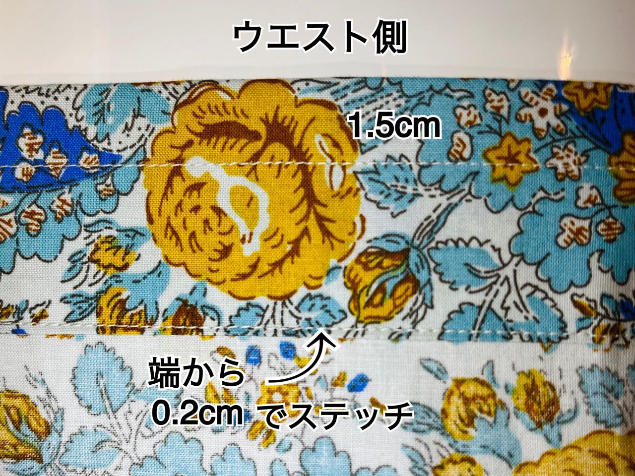 ウエスト端から1.5cmのところと折り端から0.2cmところに2本ミシンを掛けます。