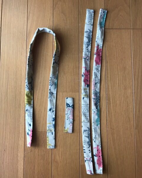 結びひも、肩ひもはとちらか一方の端を1㎝おり、四つ折りします。