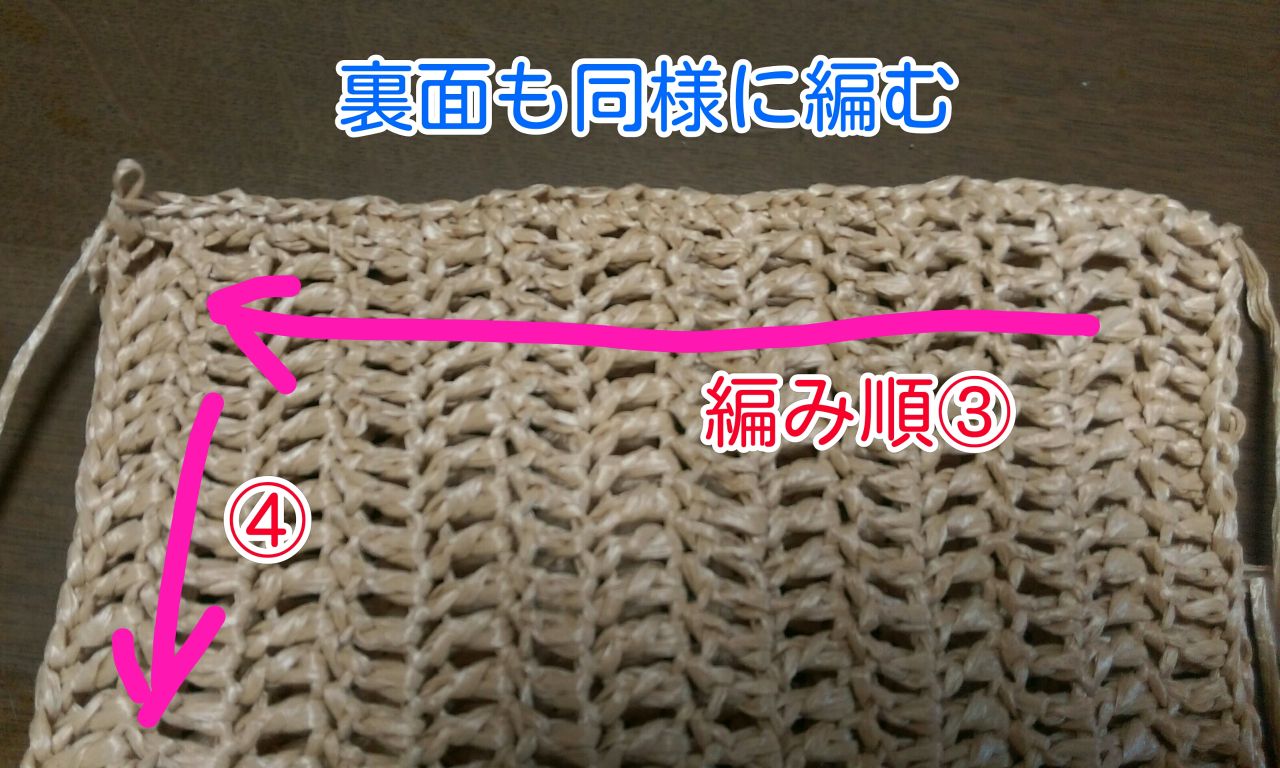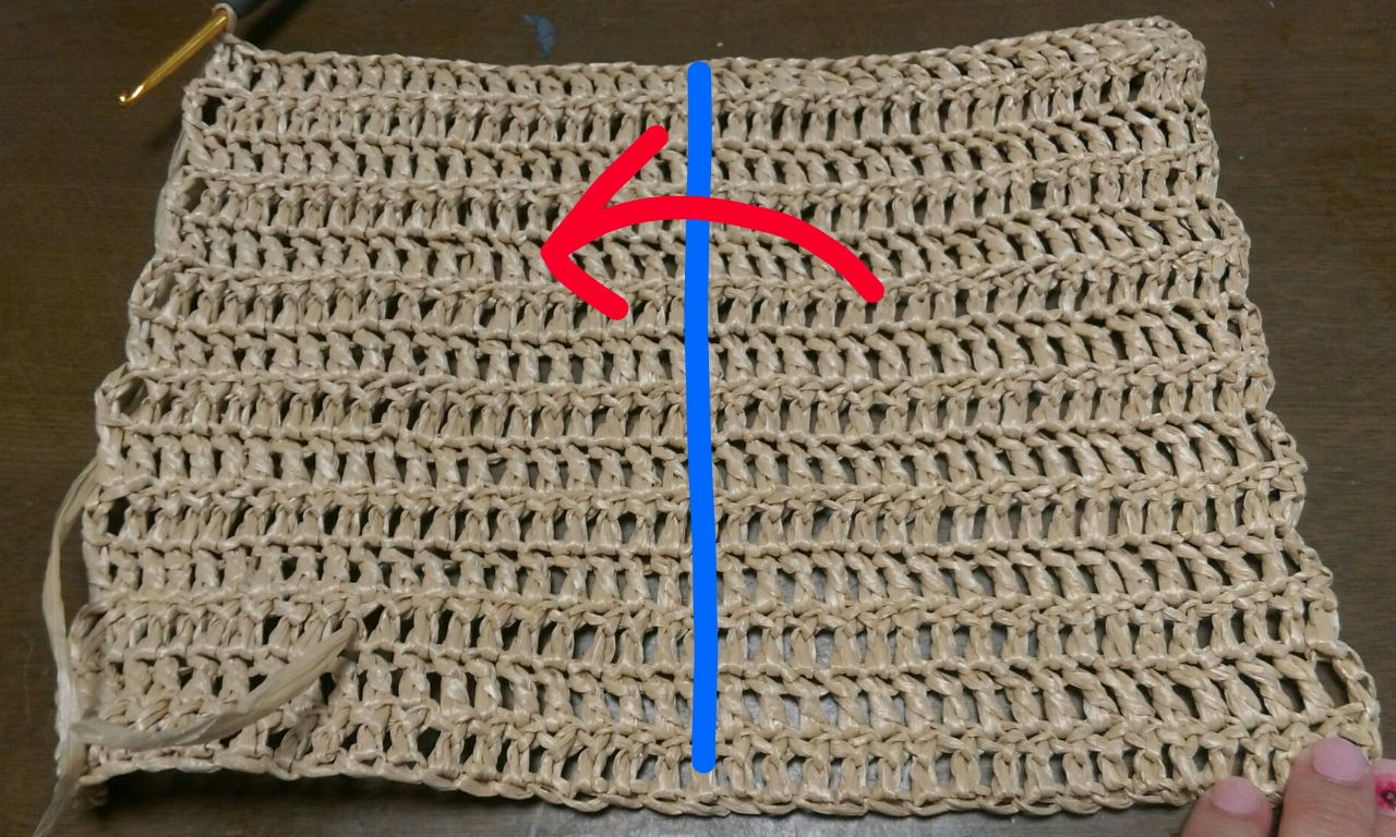 ②本体を半分に折り、バッグの入れ口側を拾って34目こま編みします。