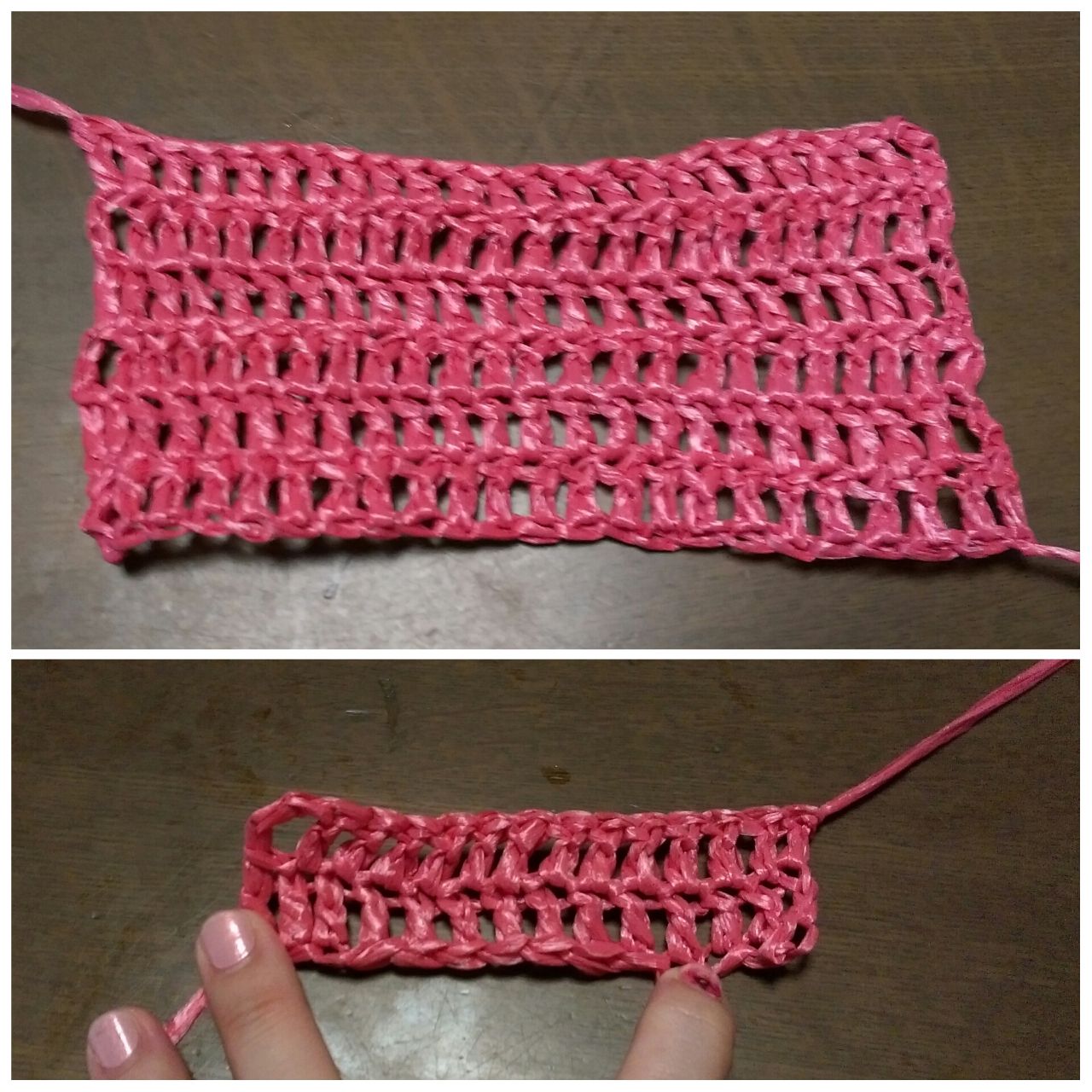 ①くさり38目つくり目し、長編みで14段往復編みします。
