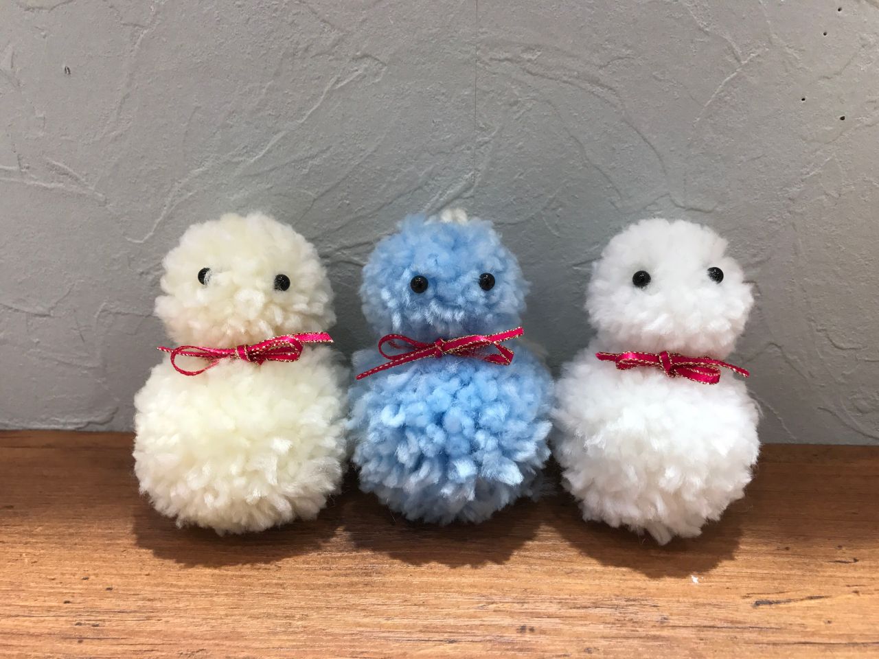 ポンポンを2個作ってつなげるだけの雪だるまくん♪ お子さんもできるので興味のあるみんな是非遊びにきてね〜〜