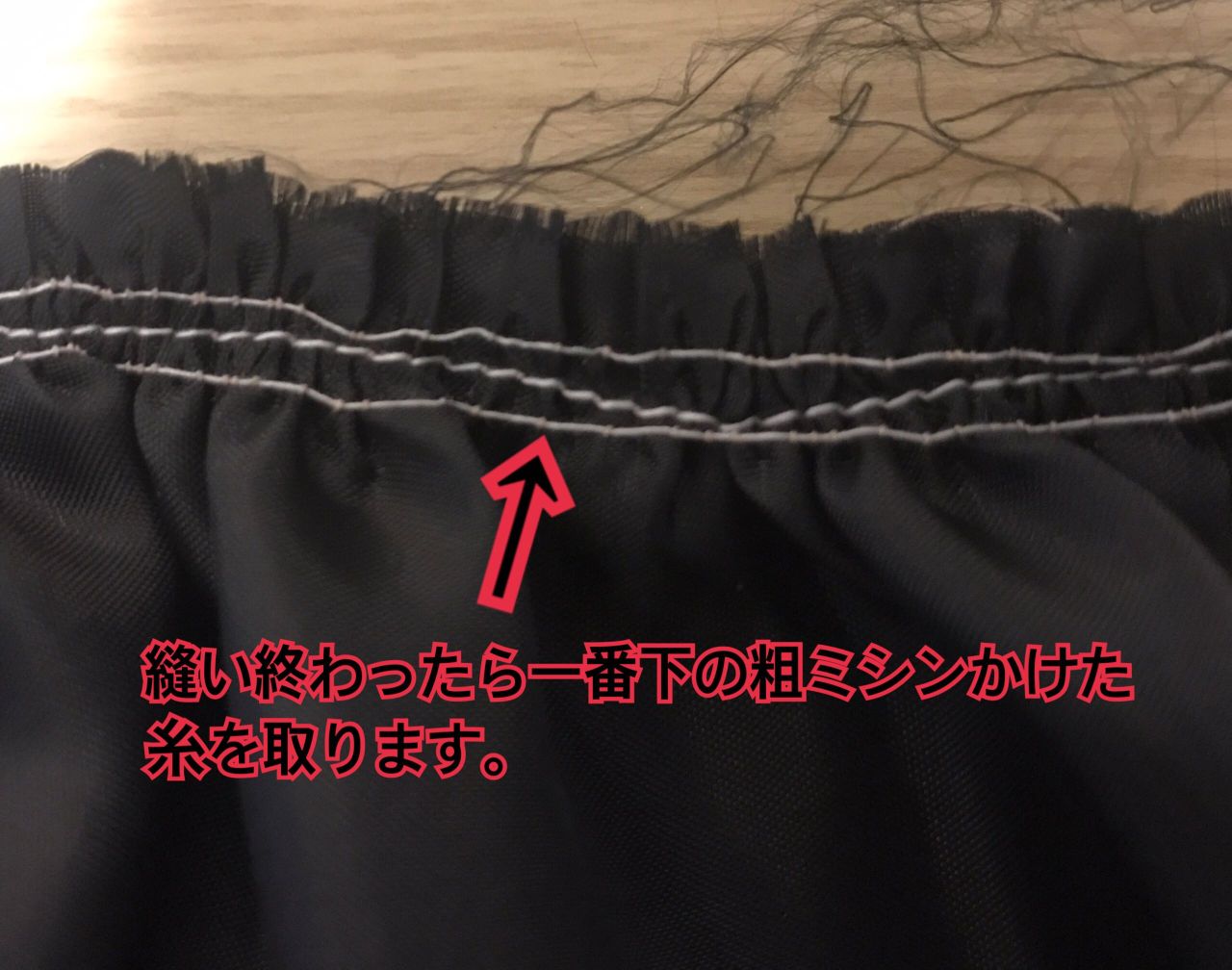 縫い終わったら、2番目にかけた粗ミシンの糸を取ります!。
