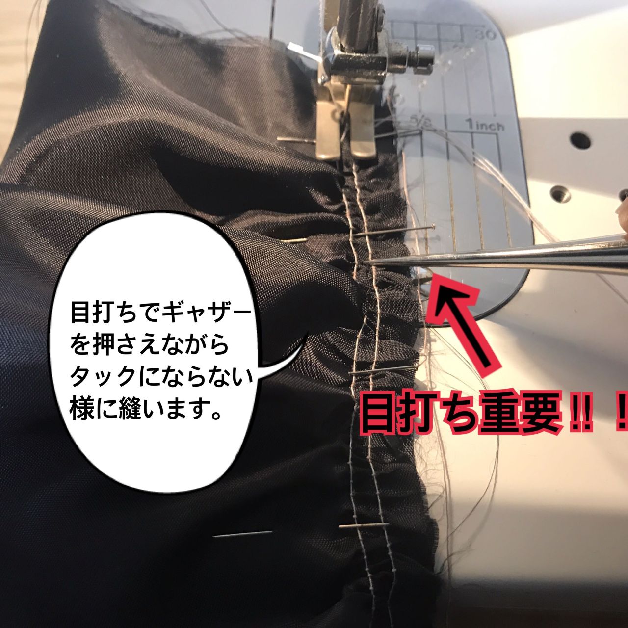 目打ちでギャザーを押さえながらぬうのがポイントです!