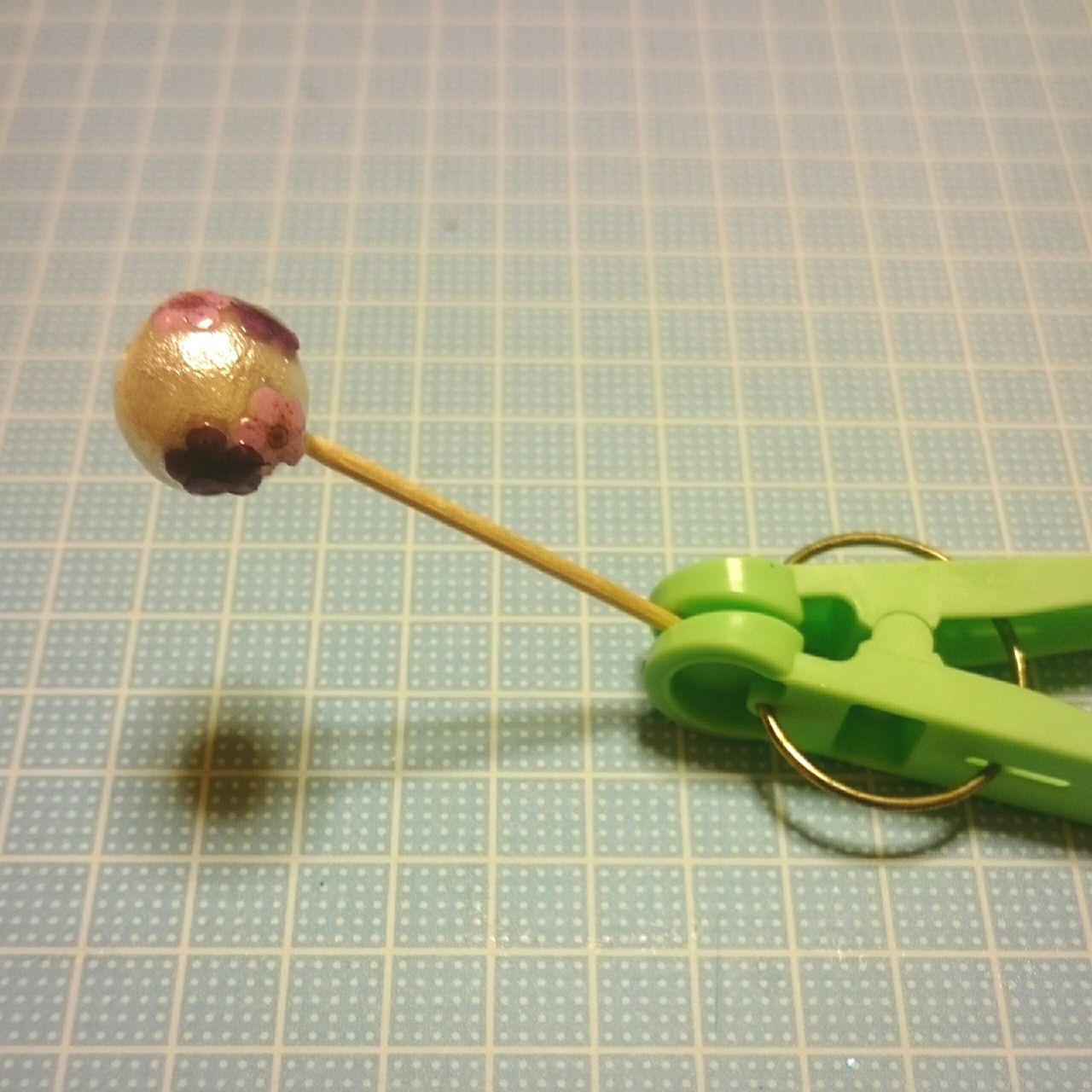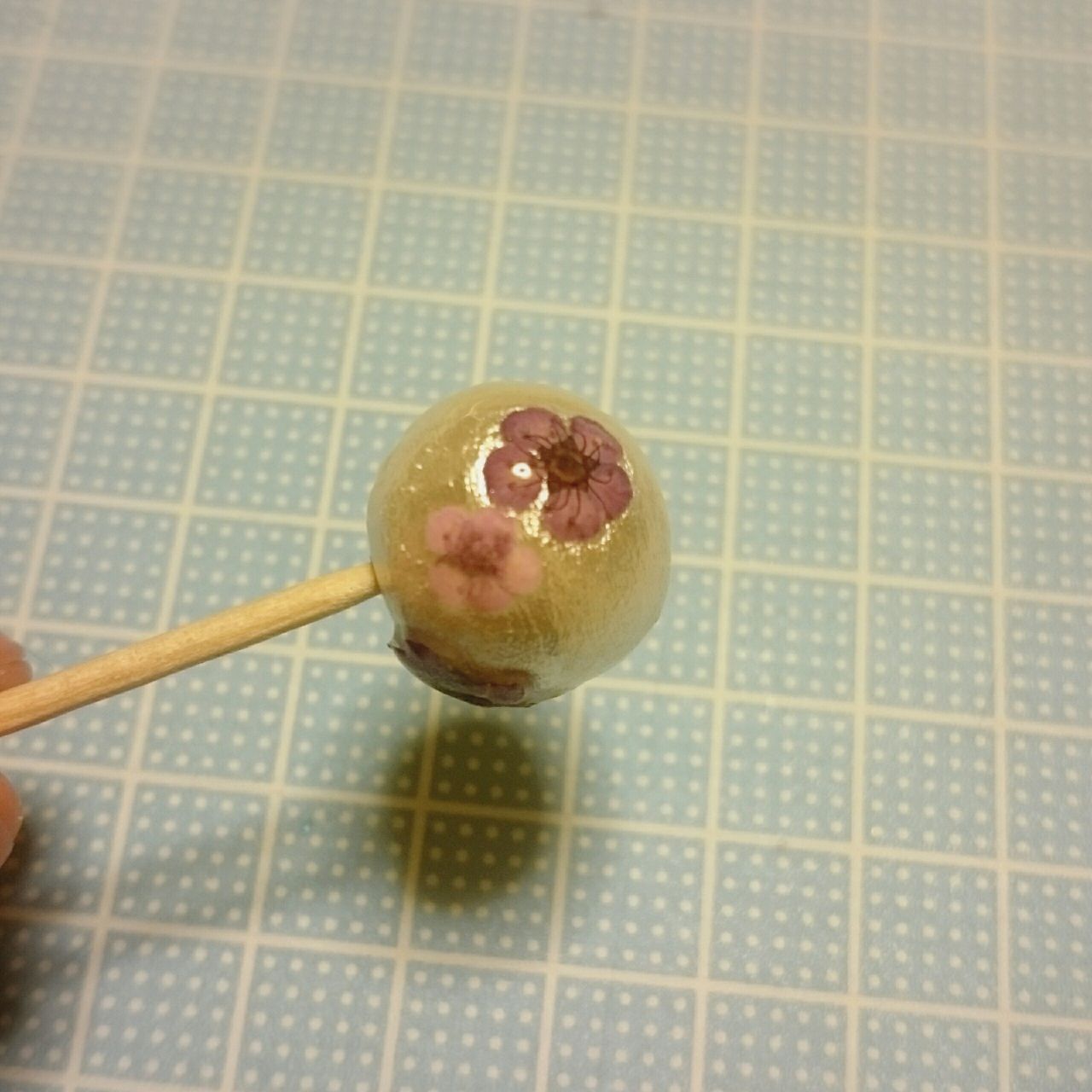 ①コットンパールにヨウジを刺して、UVレジン液で押し花を貼り付けて、コーティングします。