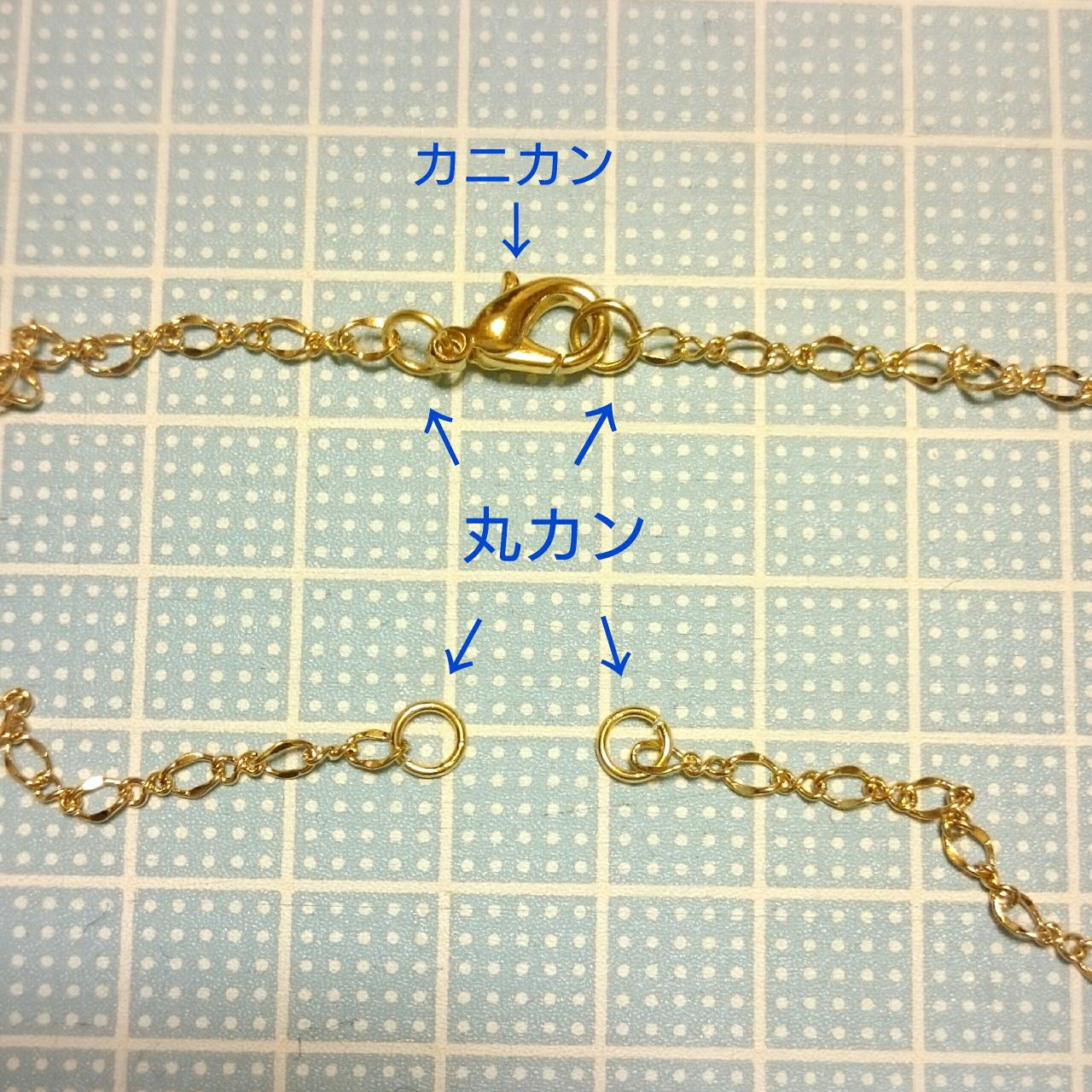 ②チェーンを二等分し、それぞれ端にカニカン、丸カンを付けます。